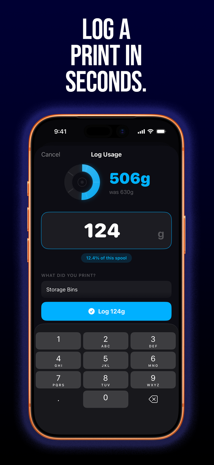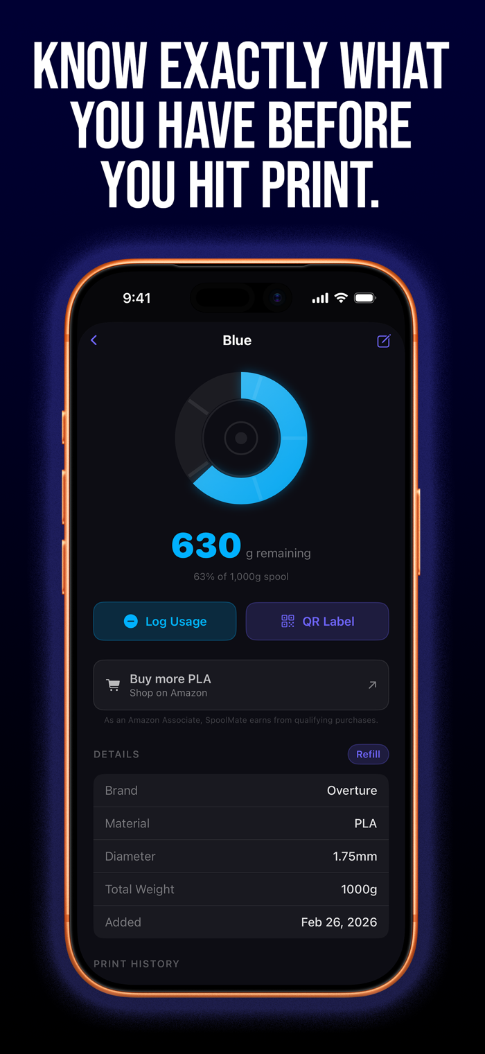 Before you start a print, check SpoolMate. See exactly how much filament you have left, make sure you have enough for the job, then log what you used when you're done. It takes seconds and saves ruined prints.