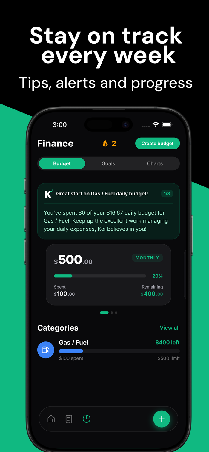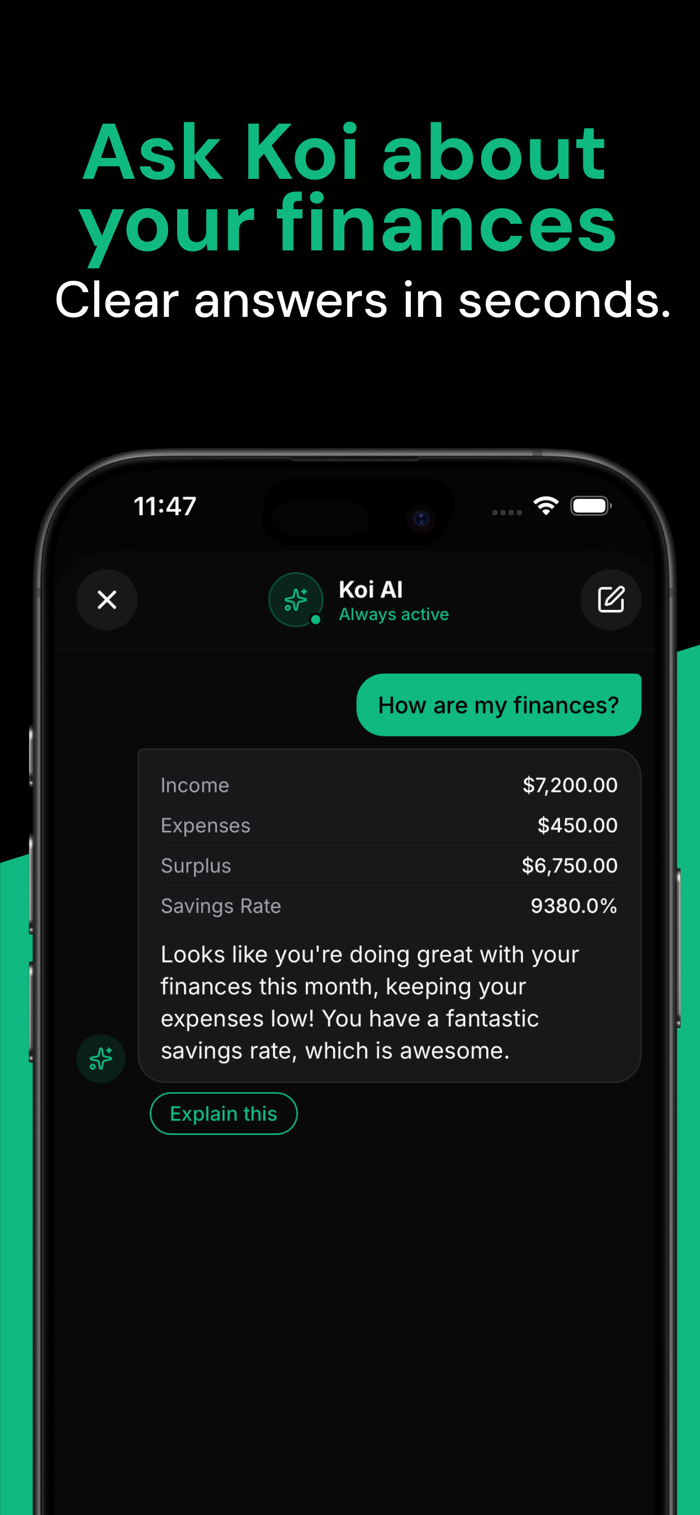 Meet Koi, your AI money coach that helps you stay on top of your finances without the usual overwhelm. Log transactions in seconds, ask questions about your money, and get simple actions to improve every day.