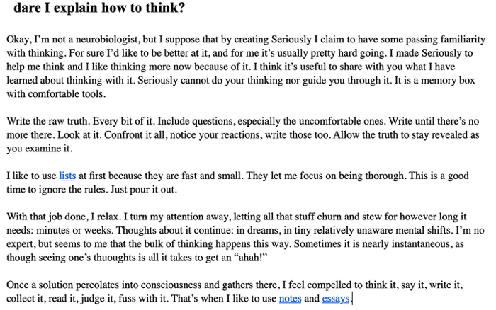 Spill your thoughts into Seriously to achieve calm and clarity, then shape them as you like. Explore depths as desired. It's fast, preventing loss of train of thought. With 5,000 ideas, some with notes and some notes with images, it helps you manage and develop your ideas effectively.