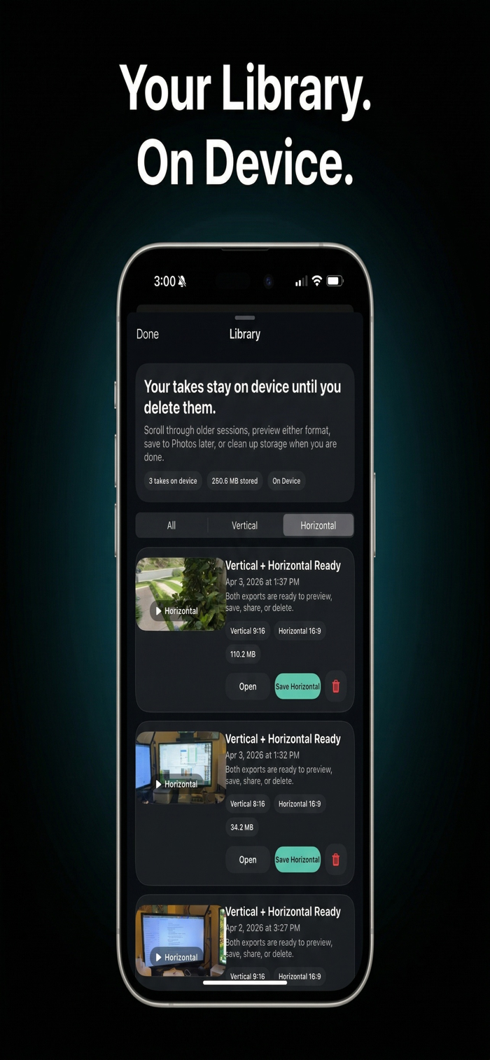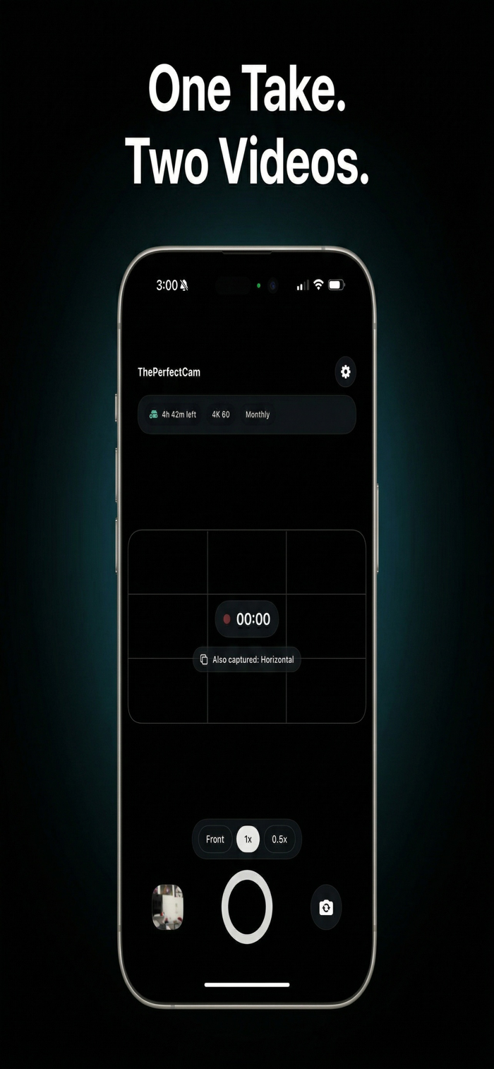 ThePerfectCam records one take and gives you two videos: a vertical clip for TikTok, Reels, and Shorts, plus a horizontal clip for YouTube.