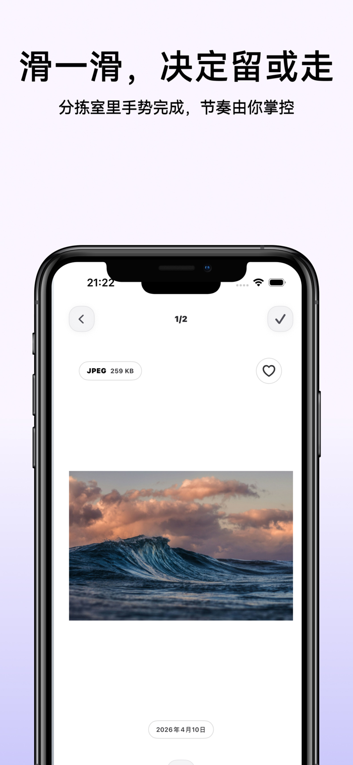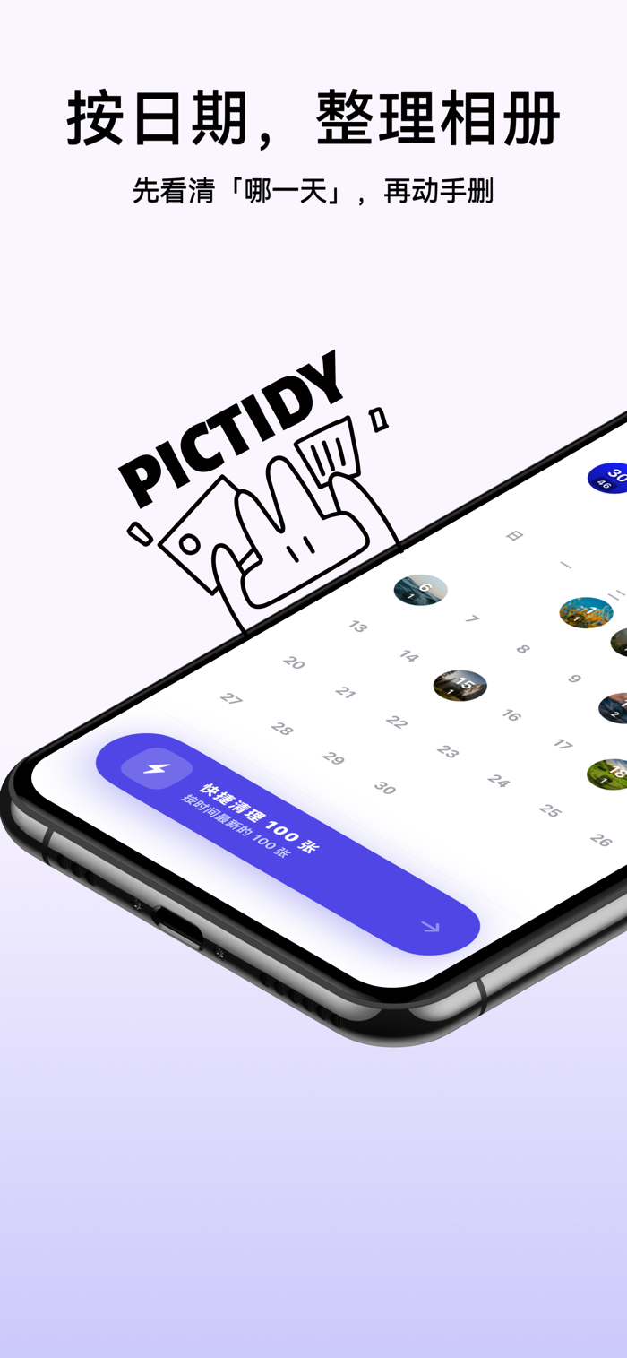 Pictidy让相册整理更便捷,按日期进入,左右滑动可保留,下滑标记待删,删除前统一确认防误删。支持照片与视频清理,清理成果一目了然。无需注册,核心处理在本地完成。