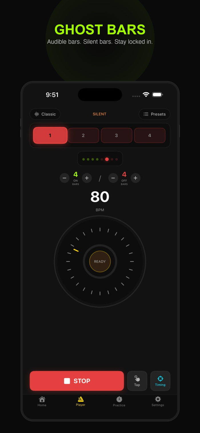Ghost Beat cycles between audible and silent bars — your job is to keep the tempo when the click is gone. It's not just a metronome. It's survival training for your internal clock.