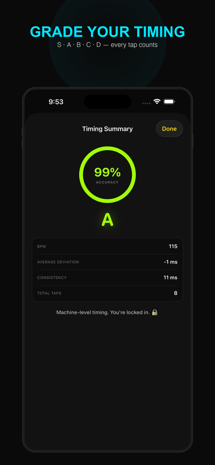 Tap along with the beat and get graded S through D. Calibrates to your touch latency, then measures your actual deviation in milliseconds.