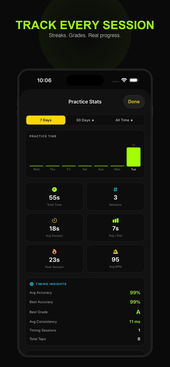 Streaks, timing grades, session history, and weekly charts. See your improvement in timing-specific terms — not just minutes practiced.