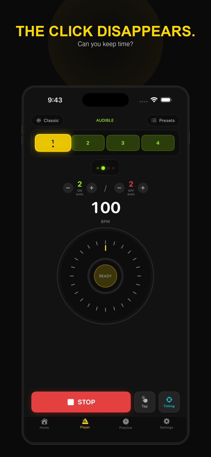 Set how many bars play and how many go silent. 2 on, 2 off. 1 on, 3 off. When the click vanishes, your real timing is exposed.