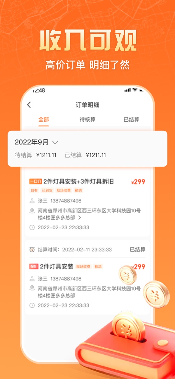 收入可观:师傅实时获得最新订单通知,进行一口价抢单或是报价接单;订单收入分类明细,信息一目了然;活动多多,福利不断。