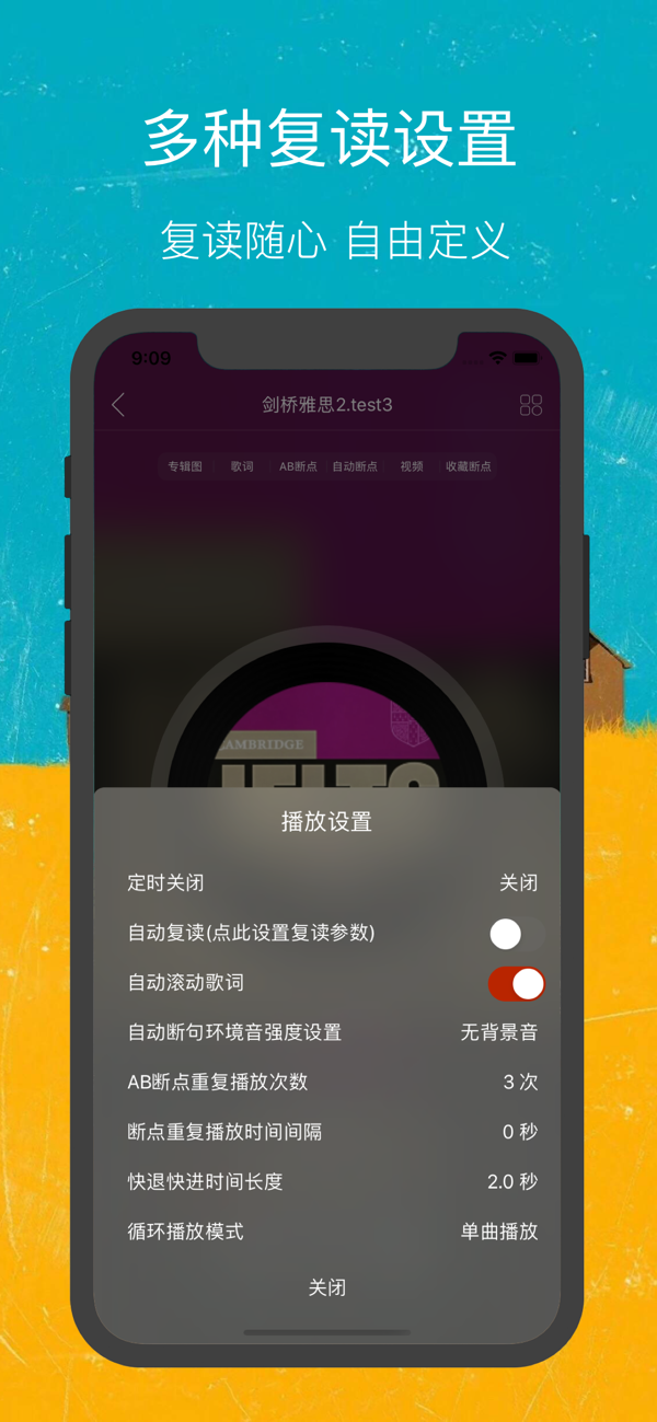 即刻复读机专为外语学习者设计,功能实用,UI简洁美观。有变速播放、AB断点复读、跟读对比、歌词复读、简洁录音等功能。支持多种文件导入,含微信、QQ、百度网盘等,还有本地Wifi导入及airdrop隔空投送。具备lrc歌词导入、流行歌曲歌词自动匹配、自动复读、锁屏及耳机线控等功能,还有AB断点排序、编辑、删除、导出,自动断句,自动断点自动复读及单词查询记录背诵功能。