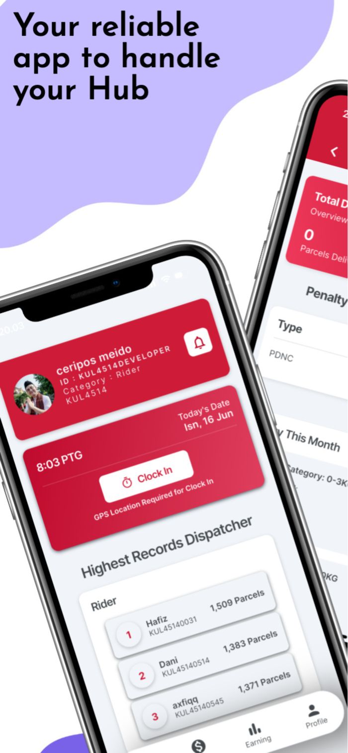 App for dispatchers to check in/out with hub radius validation, request leave or advance pay. Admins manage salary, set hub rules, and configure delivery wage settings.
