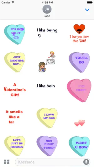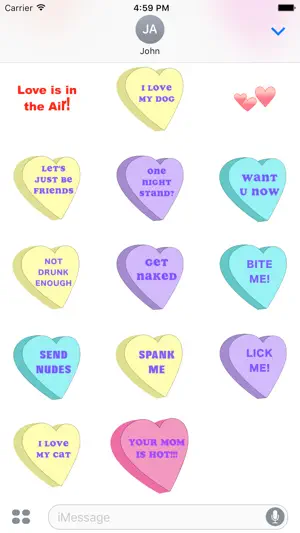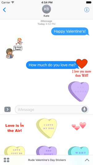 Get rude/funny Valentine's Day stickers. All but one are animated, some crude & naughty. After purchase, find them in iMessage. Click the small app store icon at the bottom of the iMessage app. If you don't see the stickers, click the four dots in the lower left corner, then the Store button, select the manage tab, and turn on the new sticker pack to use them in iMessage. Instructions also available on website (www.starlope.com) via YouTube video.