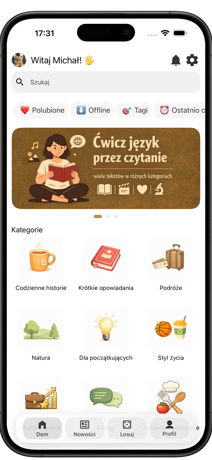 Polylect to aplikacja do nauki języków, która stawia na prawdziwe treści, a nie suche regułki z podręcznika. Czytaj krótkie teksty w różnych językach, słuchaj lektora, zapisuj słówka i obserwuj, jak z dnia na dzień rozumiesz coraz więcej.