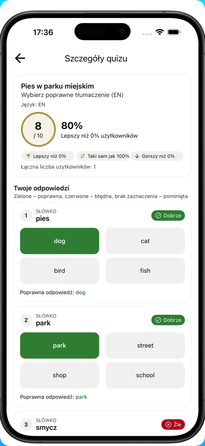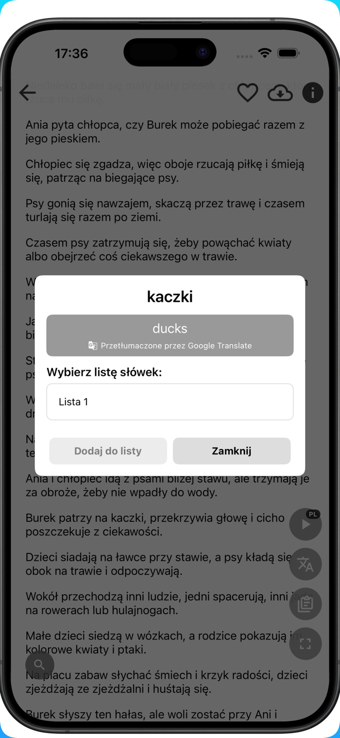 * możliwość korzystania z tłumaczenia słówek (Google Translate – tam, gdzie funkcja jest dostępna),