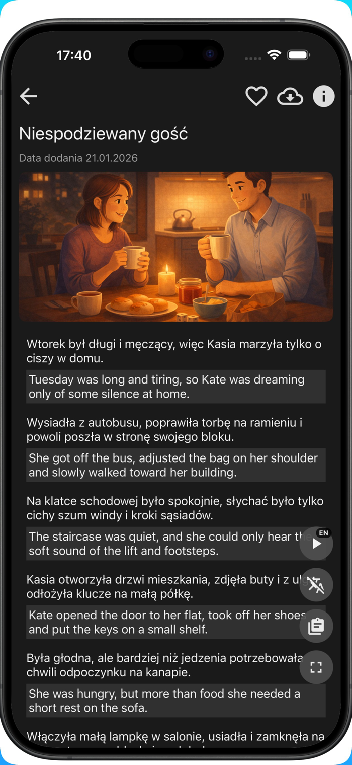 Każdy tekst możesz czytać wygodnie z tłumaczeniami, a w wielu przypadkach także odsłuchać w formie nagrania audio.