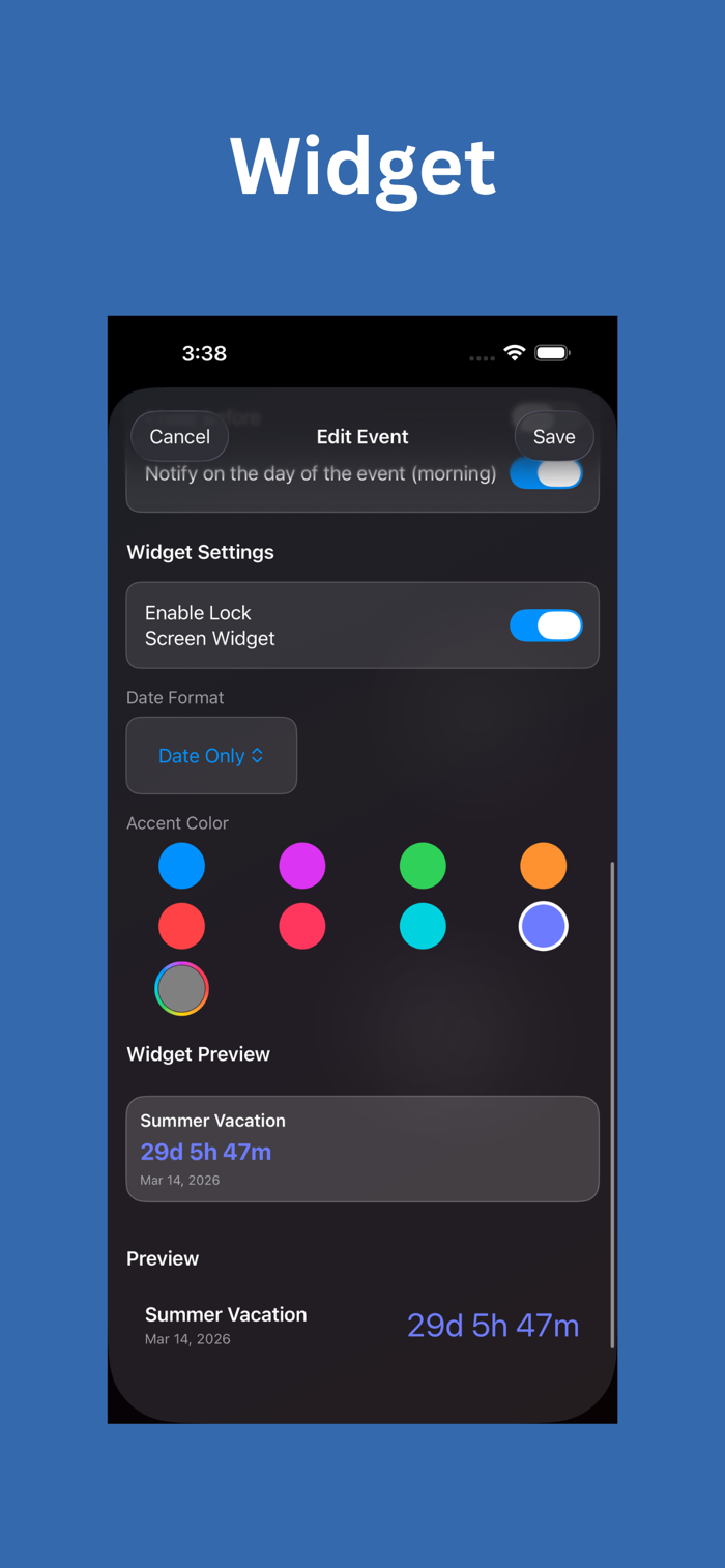 Countdown Widget能让重要时刻难忘。它有精美设计的主屏幕小部件,可自定义,有多种倒计时样式和布局,能追踪无限事件,精确到年、月、日、时、分,界面简洁优雅,无论婚礼、假期、毕业、生日等任何里程碑时刻,都能将日期醒目展示在主屏幕,让重要日子前的每一刻都特别。
