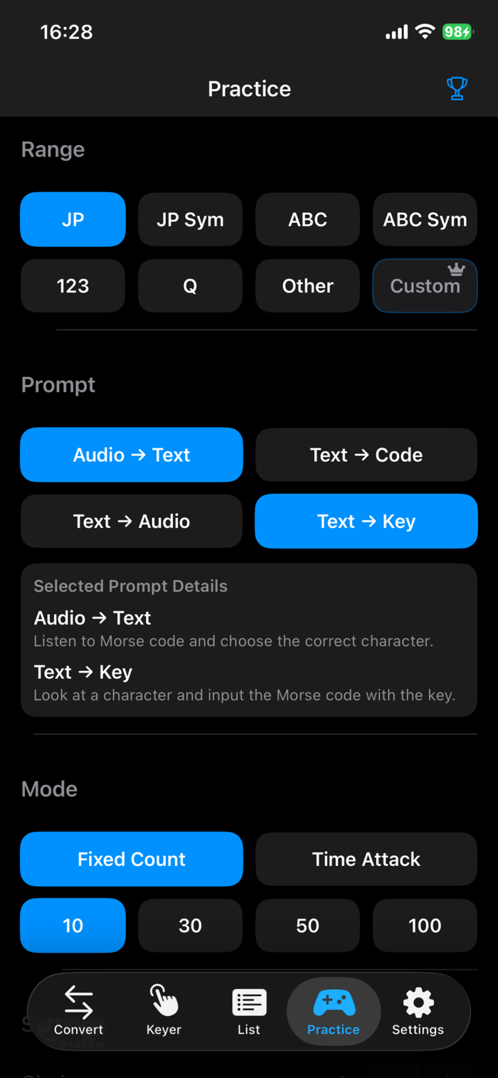 The app also includes multiple training modes with selectable ranges: answer characters from sound, answer code from characters, enter code with a key, multiple-choice practice, timed practice, and more.