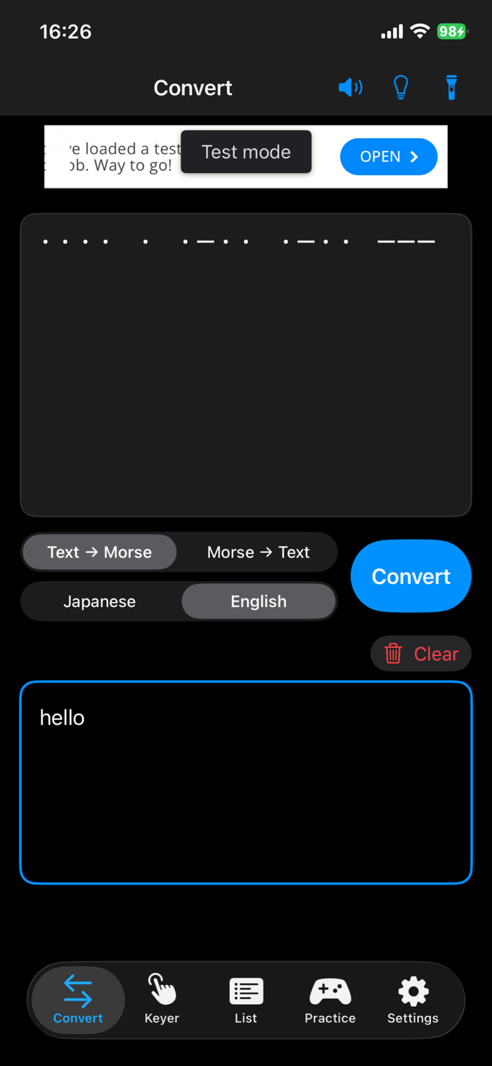 MorCon is a Morse code learning and input app that lets you convert between Japanese or English text and Morse code in both directions.