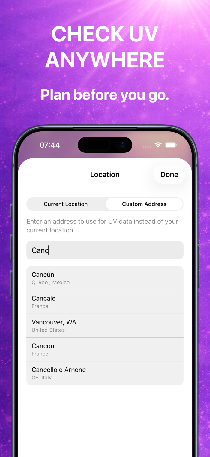 - Live UV Index — See the current UV at a glance, color-coded from chill green to full-send purple.