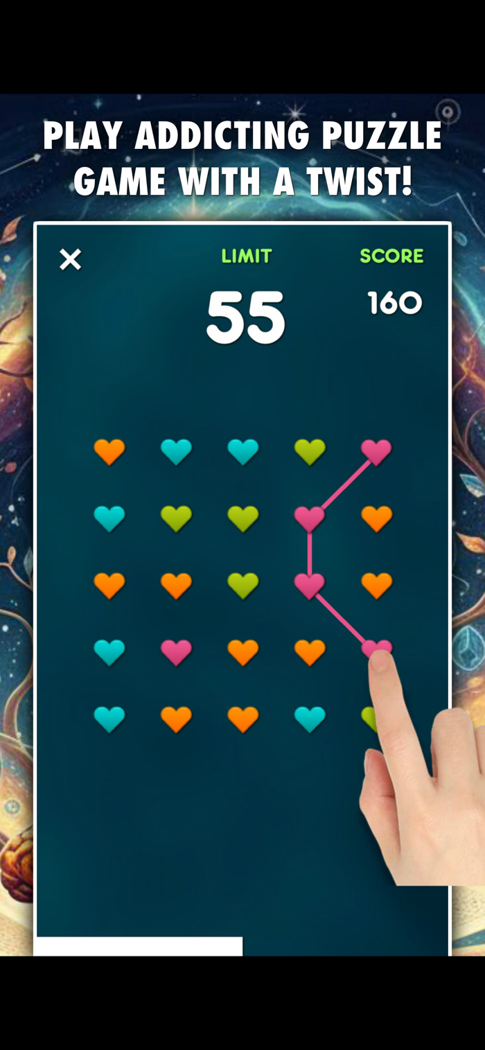 Gameplay involves sliding your finger across at least two hearts of the same color to create chains. Longer chains lead to higher scores. In Challenge mode, connect 5 or more hearts to generate new ones. Sounds easy? Try to make it into TOP20 highscores then!