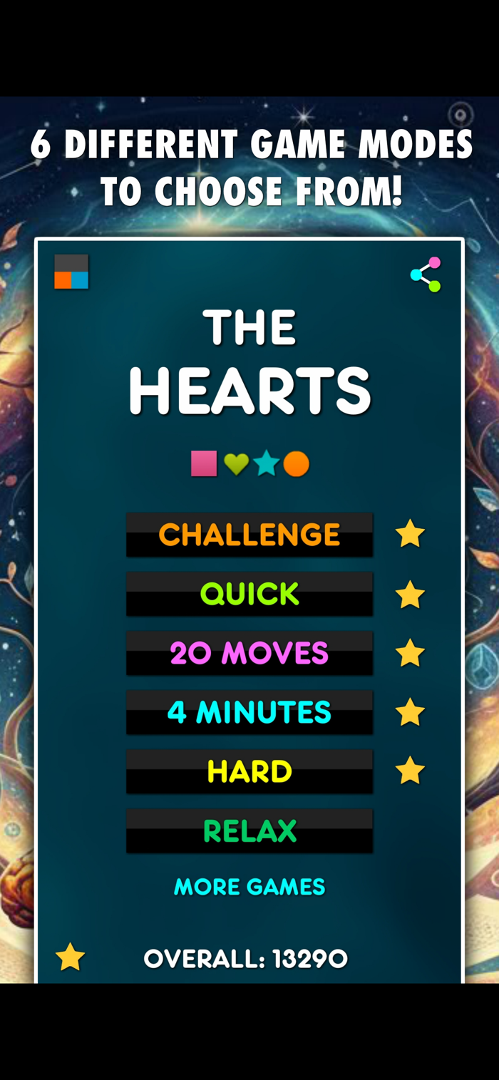 If you like symbol-matching puzzle games that require strategic thinking, The Hearts is for you! This original logic game offers 6 engaging game modes: Challenge, Quick, 4 Minutes, 20 Moves, Hard, and Relax, ensuring there's a challenge for every player!