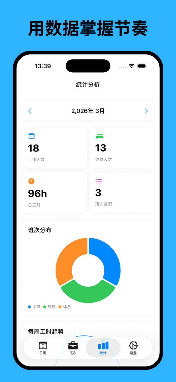 专为轮班/倒班人群设计的班次管理工具,无广告无内购。支持月/周/列表三种视图,快速排班与循环模式一键生成常用班表,班次可自定义。内置本地提醒,统计页汇总班次分布与趋势。数据仅存本地,适用于医院、工厂等轮班岗位,助你高效安排班表、掌握作息,让排班有序、生活从容。