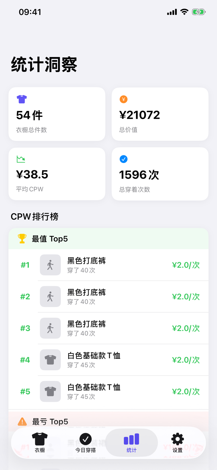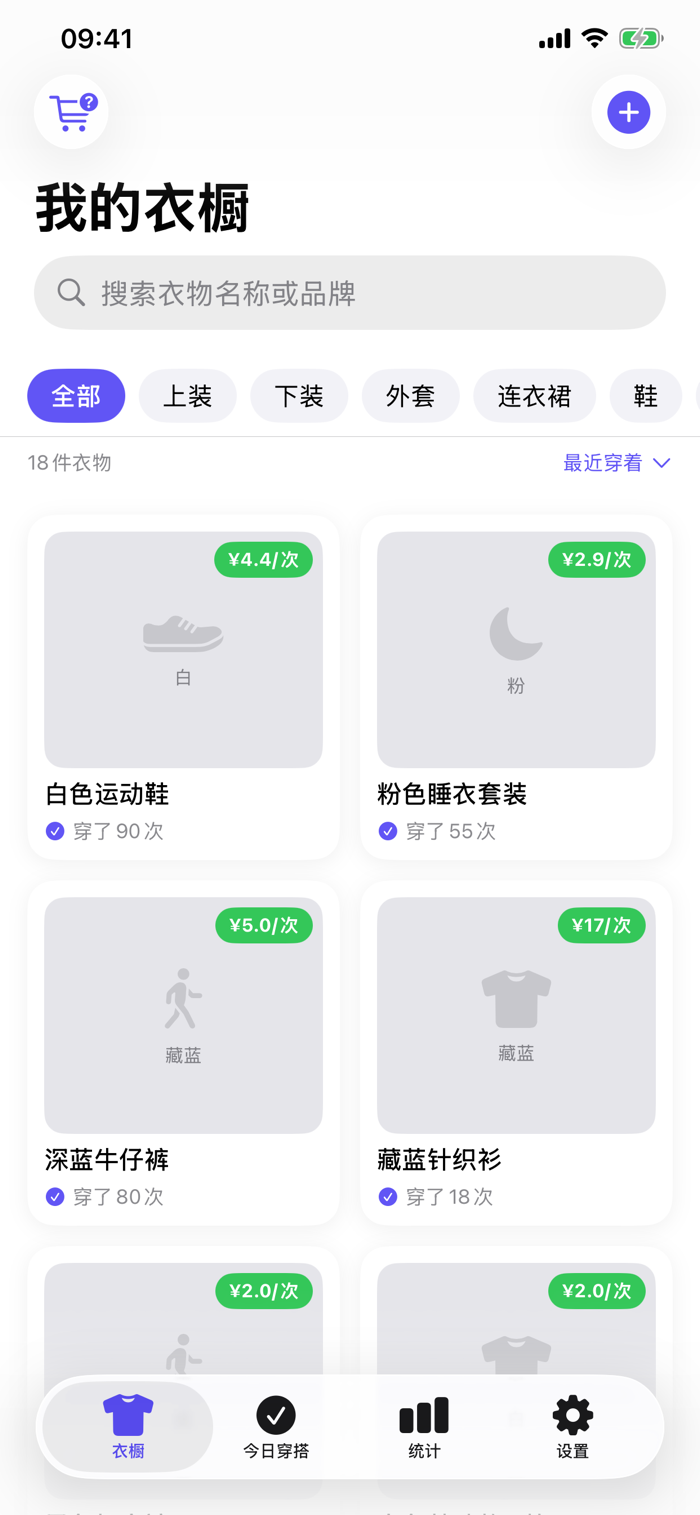 衣值是一款极简主义衣橱管理应用,帮你记录每件衣服的穿着次数和成本,用数据驱动断舍离决策,让你的穿搭更有意义。