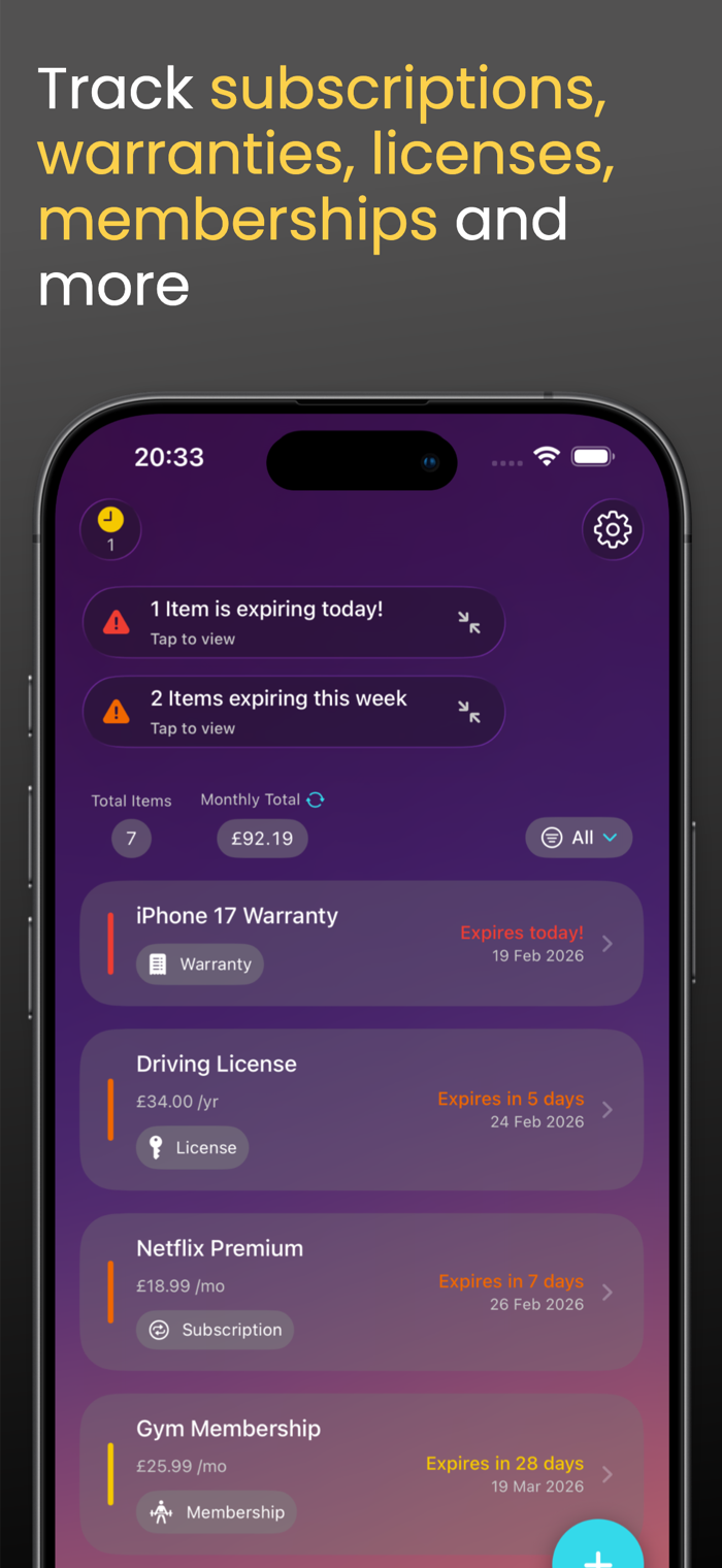 Create Items for anything that expires or renews, and group them into categories. Use built‑in types like Subscription, Membership, Warranty, License, and Policy, or define your own custom categories. Everything stays organized so you can see what you’re tracking at a glance.