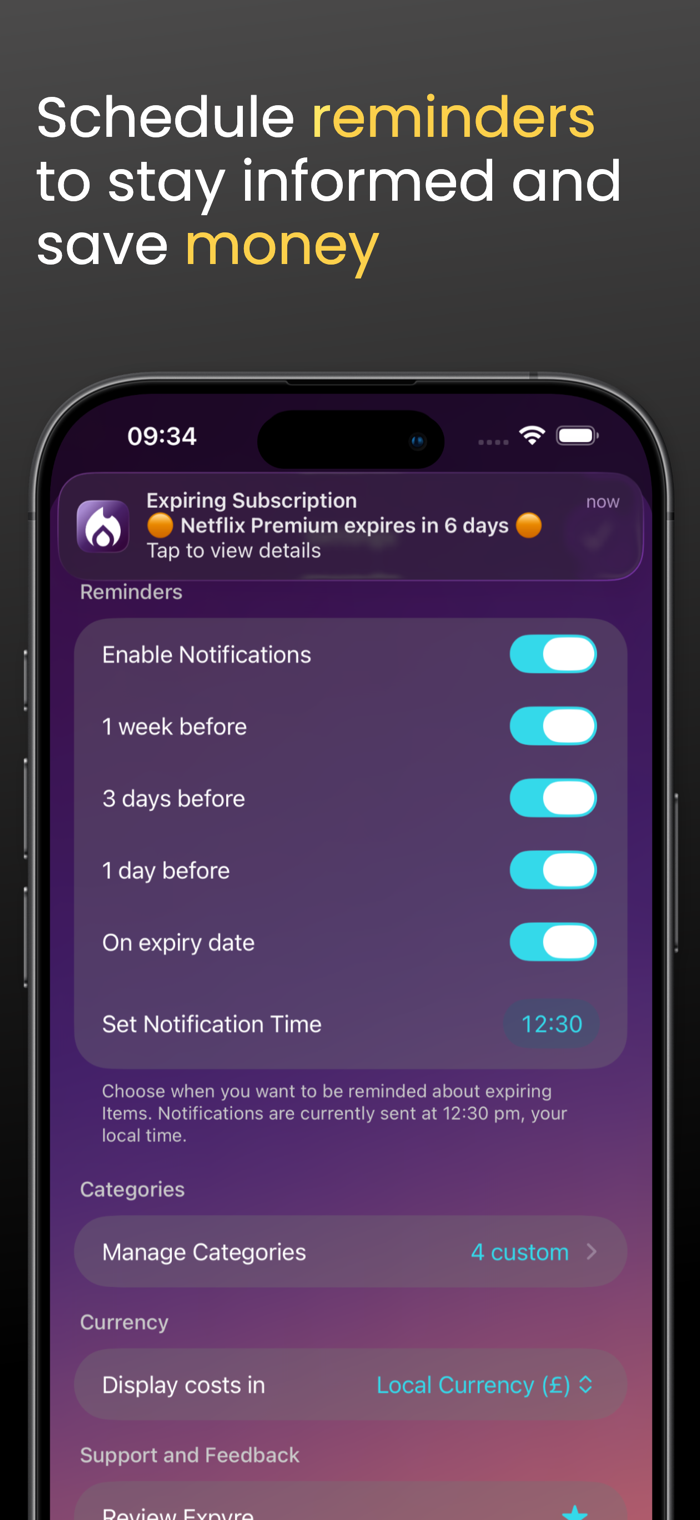 Set your own notification schedule for expiring Items. All reminders are delivered at a single daily time you choose, so you get one clear notification instead of constant alerts.