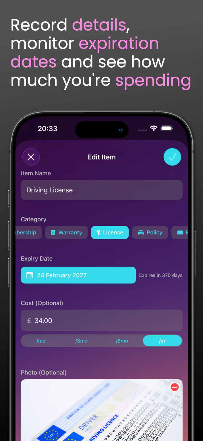 One-time upgrade unlimited Items and future premium features. The free version lets you track a limited number of Items (5) so you can try Expyre before upgrading. No subscription, no recurring charges.