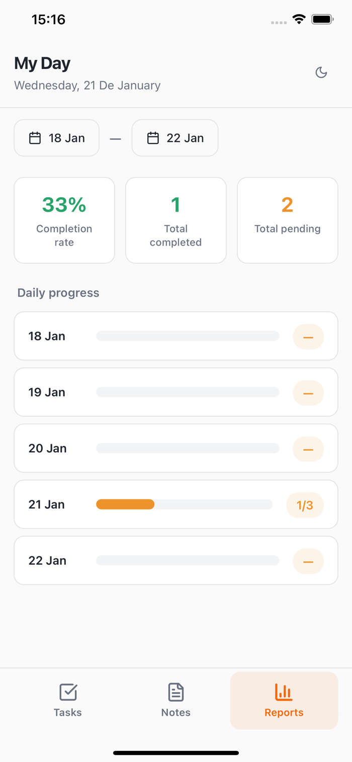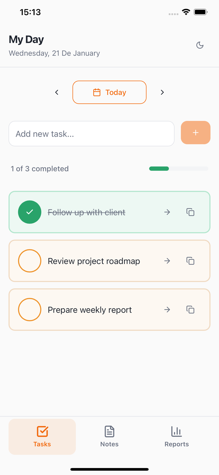 The app focuses on what really matters: planning your day, tracking tasks, and maintaining focus without unnecessary complexity.