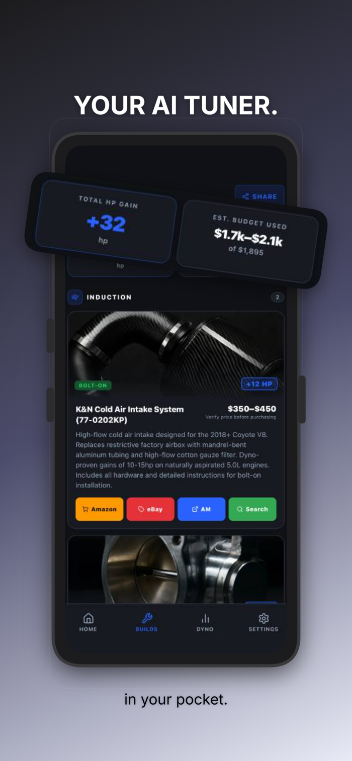 Animated dyno pull with before/after overlay, RPM scrubber, peak HP
