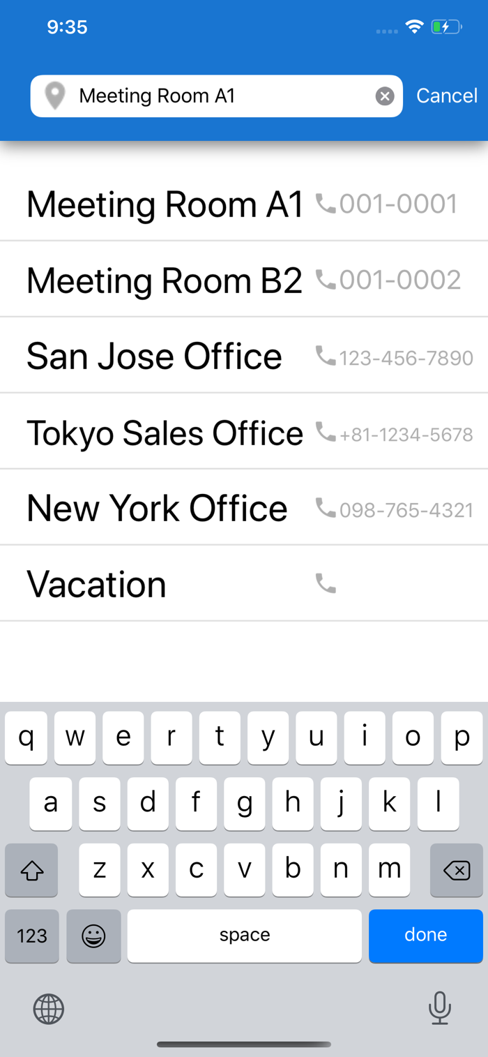 4.在“In/Out Board”屏幕上,双击人员姓名以显示目的地,电话号码和返回日期/时间编辑屏幕。点击每个项目开始输入。在输入屏幕上,设置中注册的项目显示在底部。选择该项目后,该项目将立即反映出来。