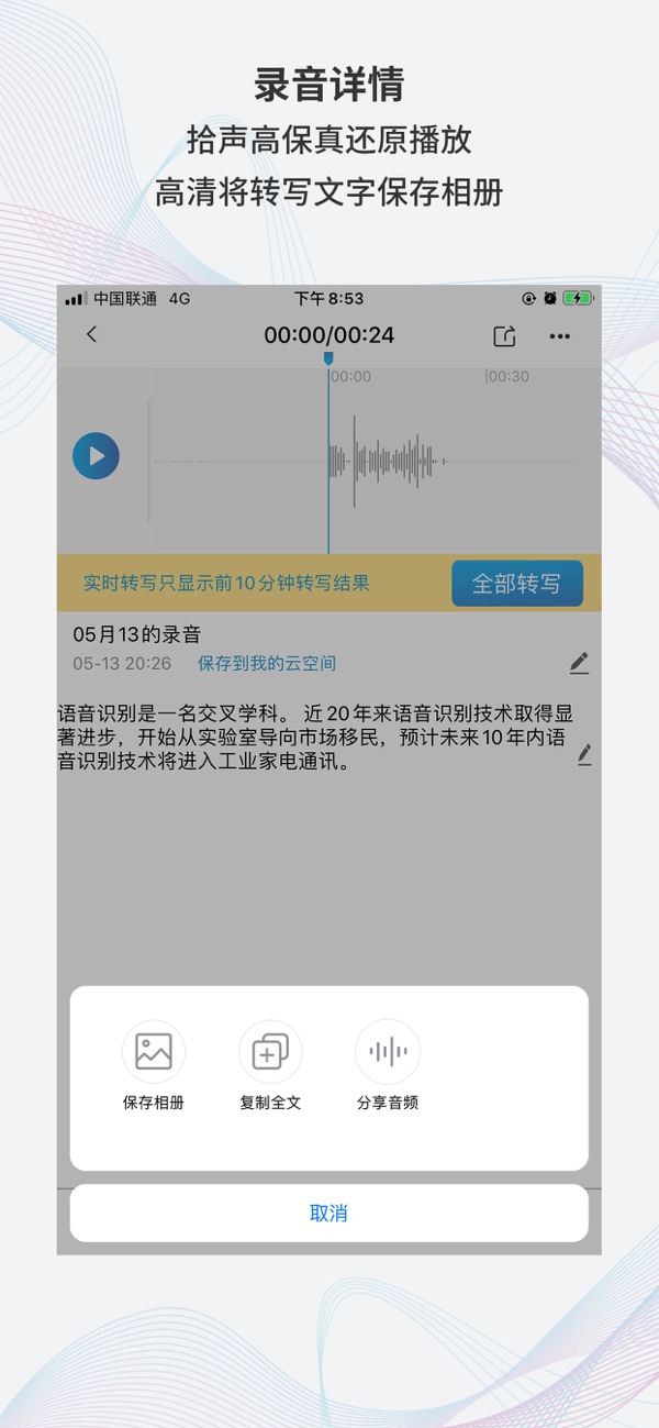 AI速记是专业录音笔管理及音频转写文字应用,配合硬件可实现高清多模式录音、实时转写文字、区分讲话人、同声传译等。集成微软、Google听写服务,1小时音频快至5分钟出稿,中文识别准确率95%。功能包括音频转写文字(支持边录边看结果、导入外部音频转写)、智能编辑整理、同声传译与语音翻译(支持多语言互译及小程序分享)、图片识别(支持多种文字识别及定制服务)。
