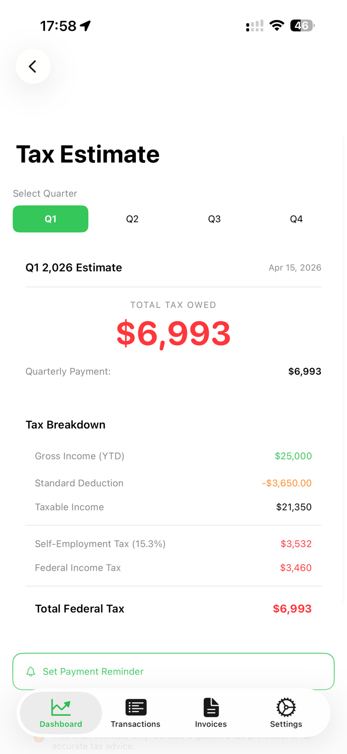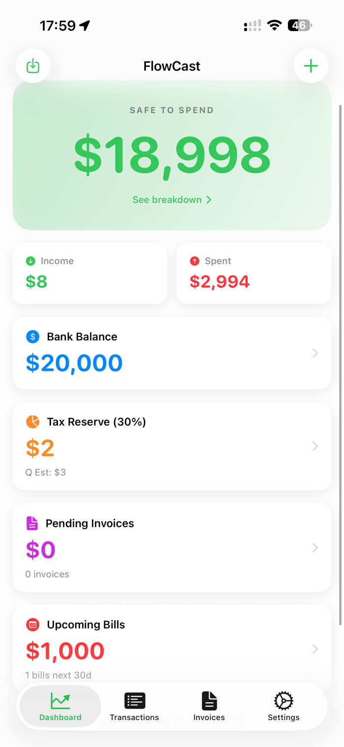 FlowCast Finance助力自由职业者和个体经营者自信回答“我今天能安全花多少钱”。它通过综合当前余额、待处理发票、即将到来的账单和费用、可控税收储备(默认25%)计算实时安全支出数。能即时查看当前安全支出,随时调整税收储备,提前规划账单、到期日和收入缺口。还可跟踪发票到期日和状态,获取逾期提醒,监控费用,支持CSV导入导出数据,提供自动税收储备计算、季度估算支持、截止日期跟踪等税务功能。