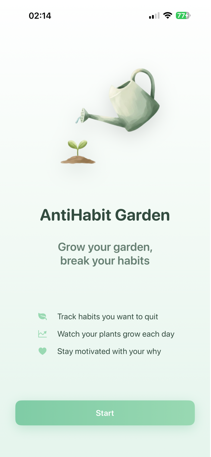 AntiHabit Garden可将不良习惯转化为美丽花园,助你追踪摆脱不良习惯的进度。能同时追踪多个反习惯,随你进步植物生长,有反映成功的可视化花园,界面简单美观且激励性强,无需账户,数据私密,一次性购买可去广告。添加想改掉的反习惯,每天避开就能让植物生长,看着花园绽放感受成功,因打破坏习惯不易,传统追踪器冰冷数字化,它让过程有回报。