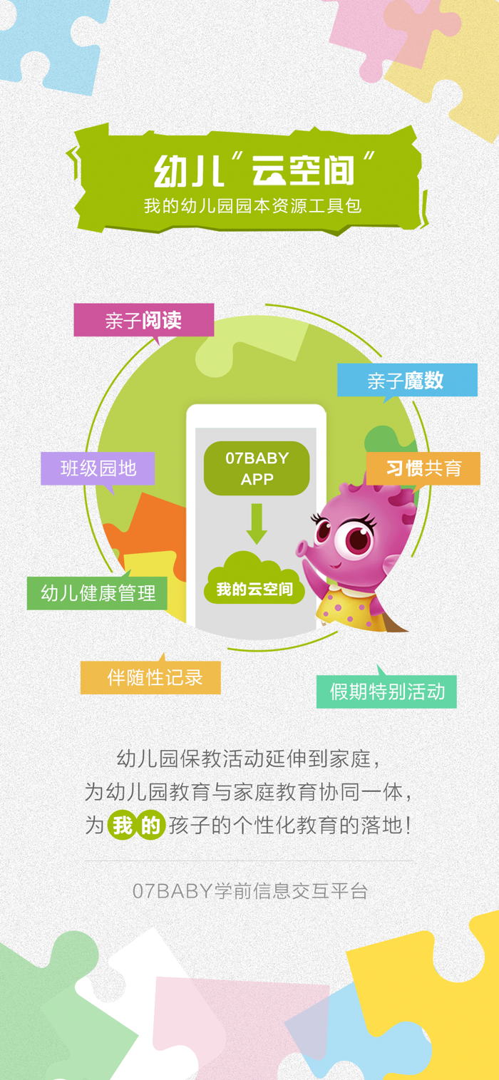 07BABY学前行业信息交互平台——是深圳市泽维电子科技有限公司历时13年打造的自有知识产权的学前行业互联网服务平台。 旨在为幼儿园等学前行业组织机构,实现办公管理数字化,实现把幼儿园教育延伸到家庭,实现幼儿园信息向行政管理部门实时上报,形成行政管理部门、幼儿园、家庭、社会服务机构一体化的学前 互联网行业信息格局,是协同一致的学前行业信息交互平台。 07BABY-APP是07BABY学前行业信息交互平台的手机端,是老师、家长适用的工具型APP。