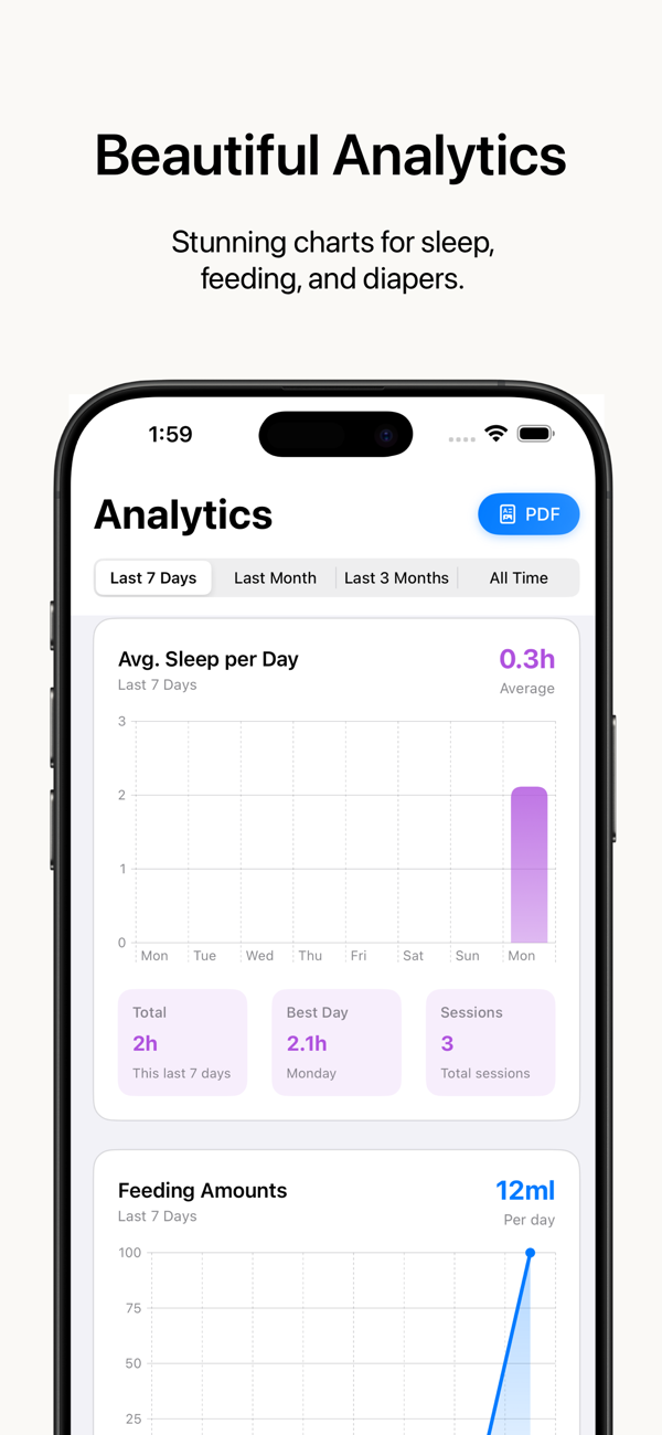 Babyboard提供全面的宝宝追踪功能,包括喂养记录(瓶喂、亲喂、辅食,含时长和量)、睡眠模式监测、尿布更换追踪。数据本地存储,保障隐私。有美观的分析功能,能将宝宝数据转化为图表和见解,还能导出详细报告供医生看诊。无需订阅,一次付费终身使用及更新。它由家长打造,专为真实家庭设计,非数据收集公司,先进分析仪表盘可将日常记录转化为有意义的洞察。