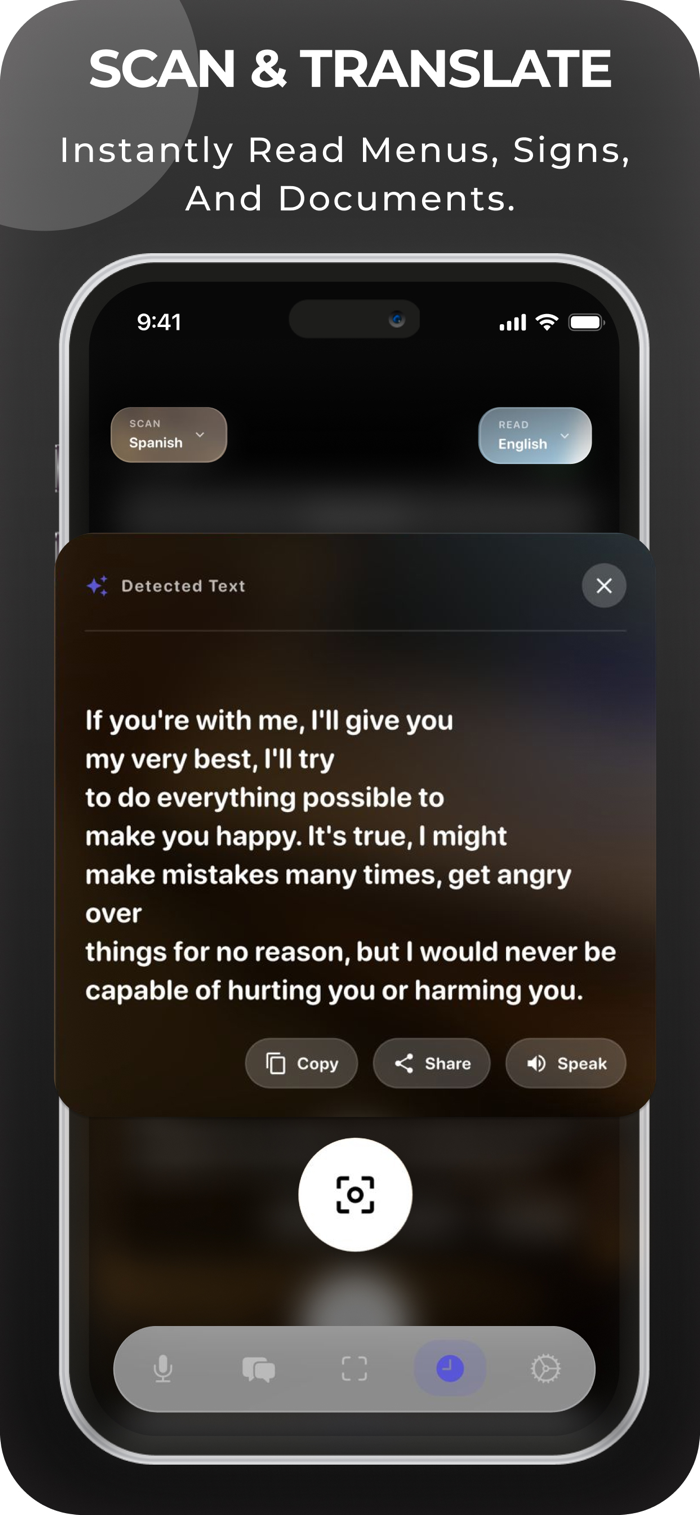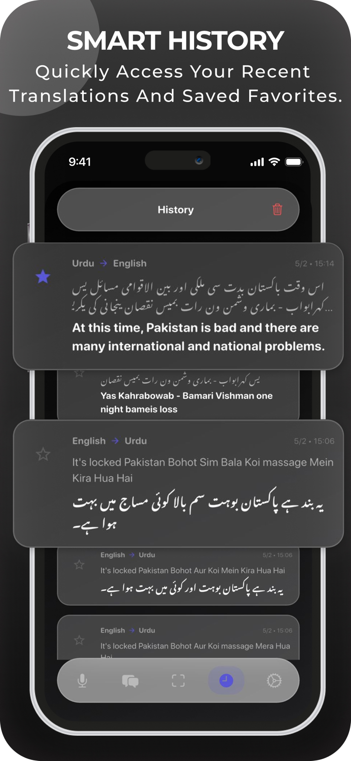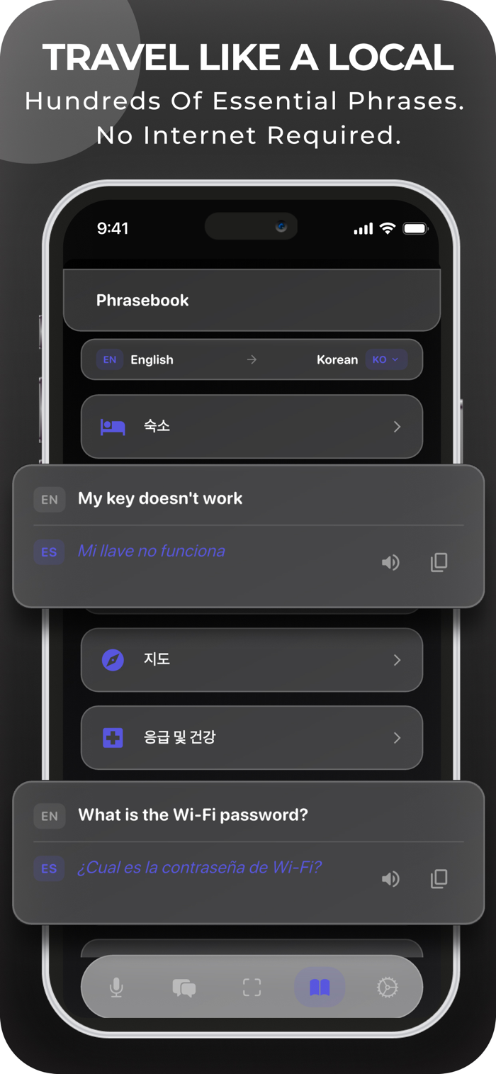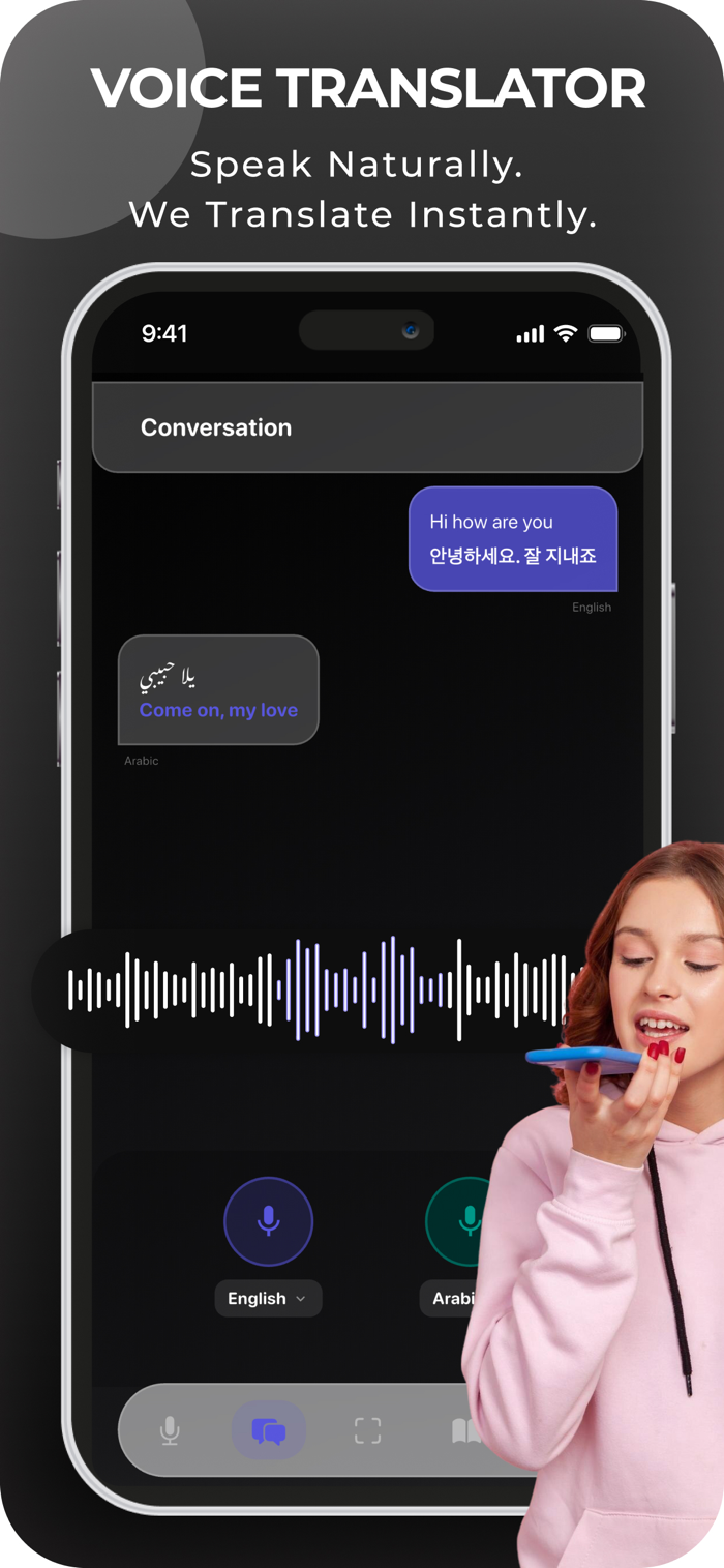使用双麦克风“面对面”模式进行自然对话。应用会自动聆听、翻译并朗读译文。