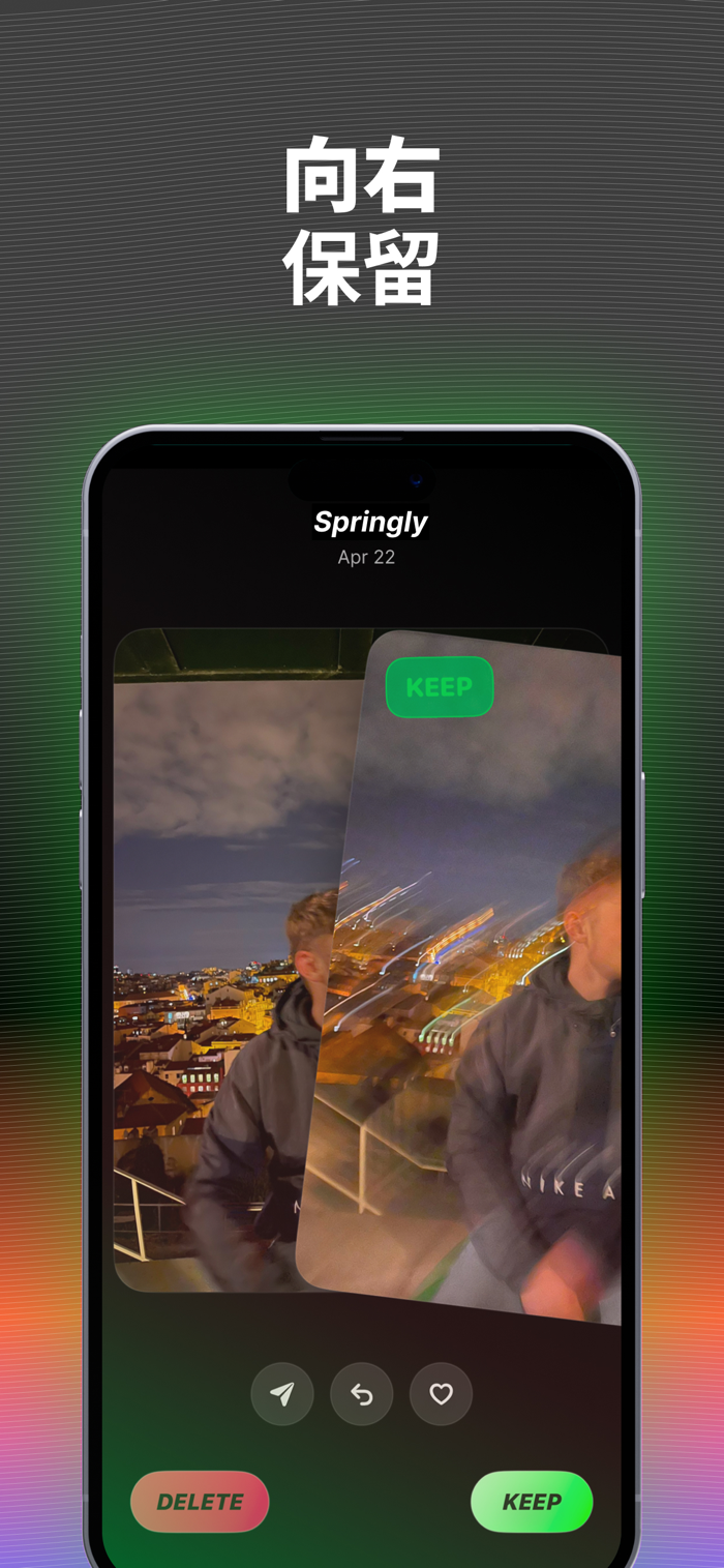 Springly让照片整理轻松有趣,还能释放iPhone存储空间。告别繁琐列表复选框,通过滑动手势整理清理照片,体验直观又顺畅。可直接在应用中与朋友分享选定照片,保留珍贵回忆。所有照片本地处理,不上传存储到外部服务器,遵循Apple标准EULA,使用条款:https://www.apple.com/legal/internet-services/itunes/dev/stdeula/ 。其主要功能有:用滑动手势整理清理照片、释放iPhone存储空间、与朋友分享照片。