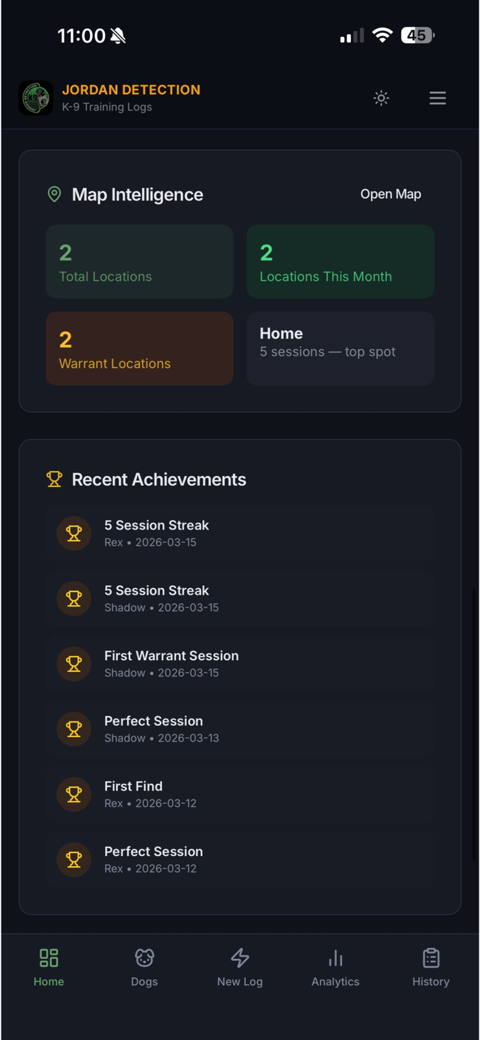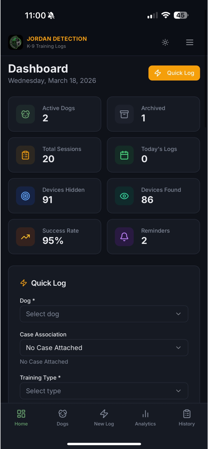 Jordan Detection K-9 Training Logs is a professional training and documentation platform built for working K9 teams. Designed for handlers, trainers, and supervisors, it provides a complete system for logging training sessions, tracking certifications, managing cases, and organizing operational records.