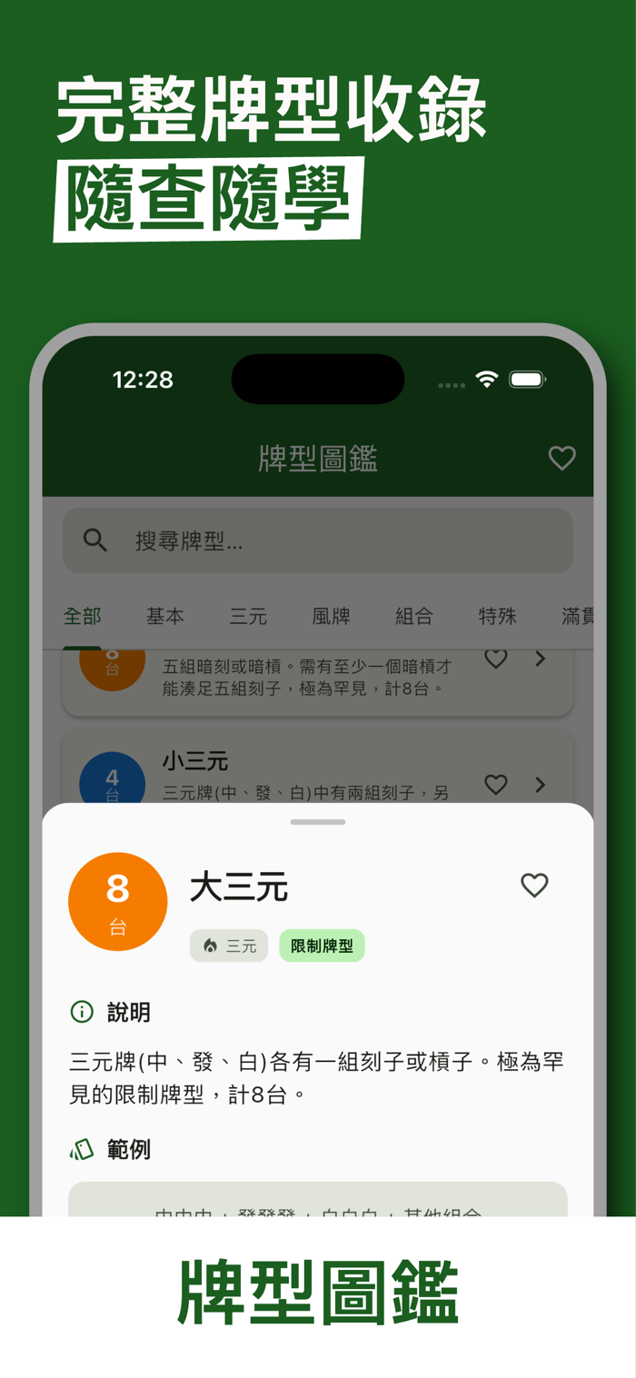 收錄所有台灣麻將台型,清晰分類、快速查詢。附帶技巧說明與範例,支援收藏常用牌型。
