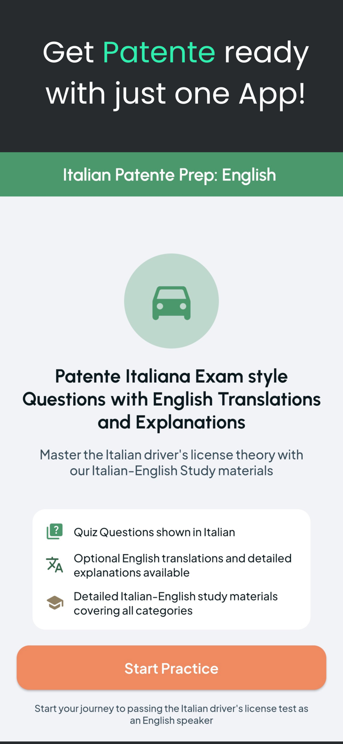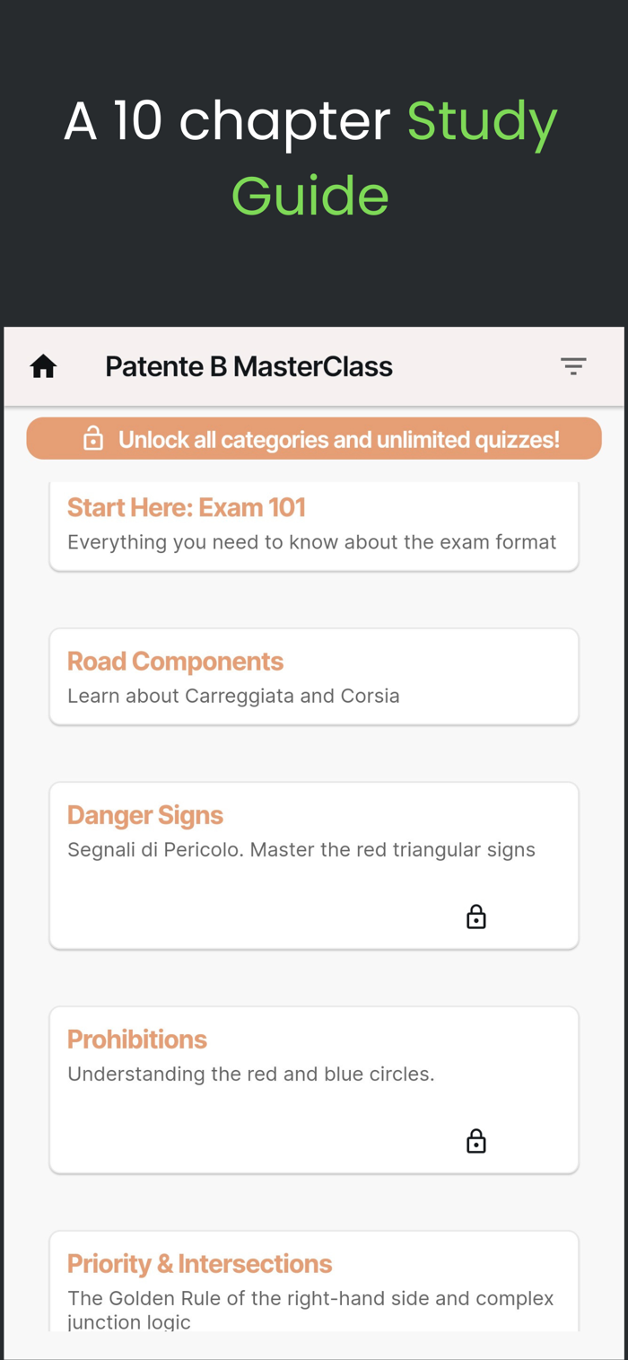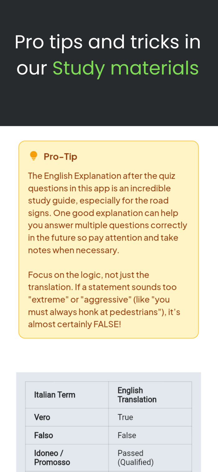 Italian-English Study Materials: No more struggling to translate an entire book to understand the driving rules, we have a summarised 10 chapter Italian/English study guide covering all categories (Freemium feature).