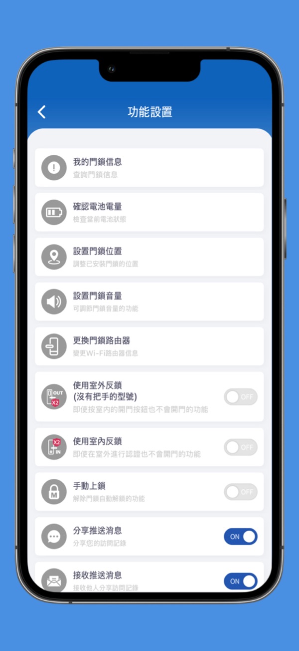 (6) 雲端設定功能 : 透過App可設定自動&手動上鎖, 室外反鎖, 音量調整, 軟體更新等多種功能