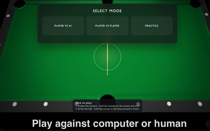 这是一款 3D 台球游戏,能提升你的台球技巧。有玩家对战 AI、玩家对战玩家及练习模式,遵循经典 8 球规则。具备精准瞄准辅助和球轨迹引导,3D 球桌与灯光细节丰富,音效清晰、性能流畅,加载快、操控灵敏。
