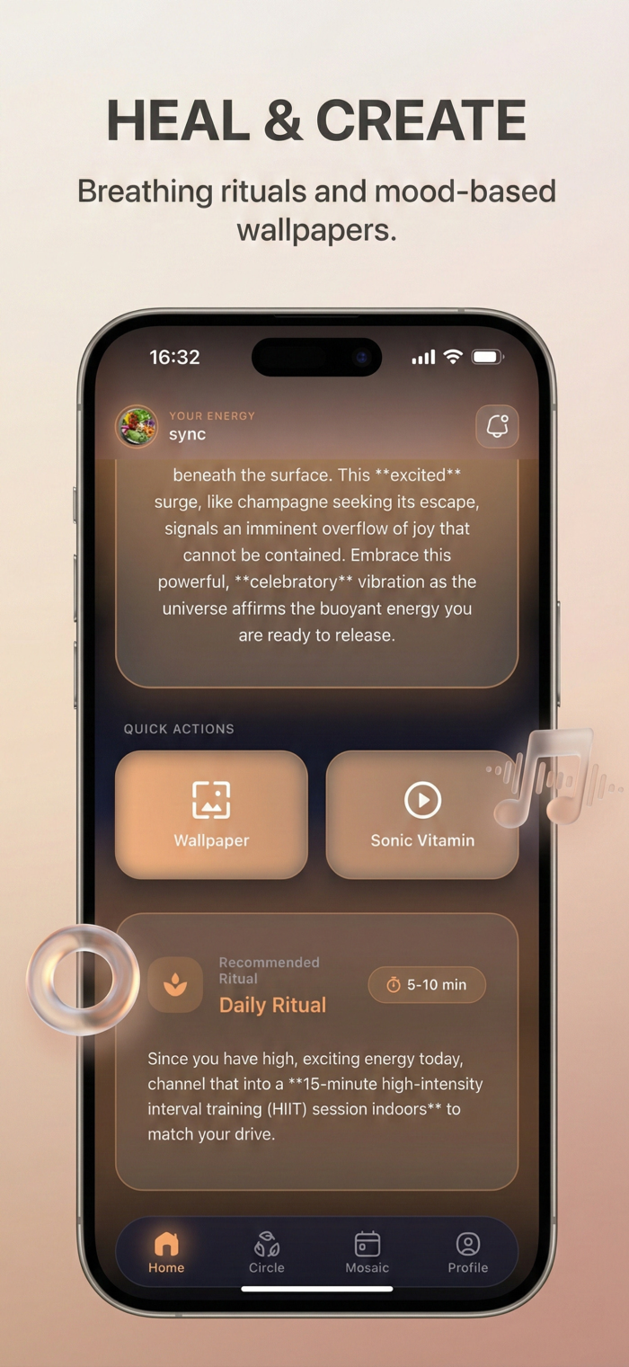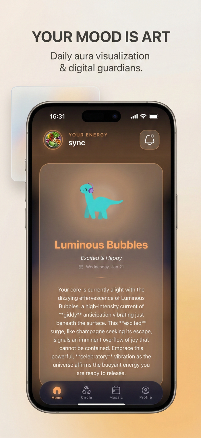 Synesthetic Social: Stop scrolling past text status updates. See your inner circle’s real-time energy. Know when a friend is "Stormy" or "Radiant" instantly.