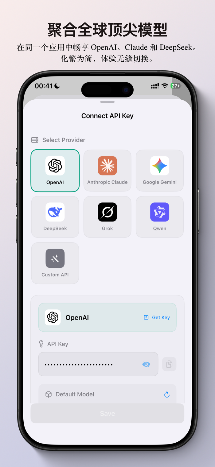 汇聚主流大模型,完美兼容通用 API 标准。无需在 App 间反复切换,随时调用最适合的“最强大脑”。