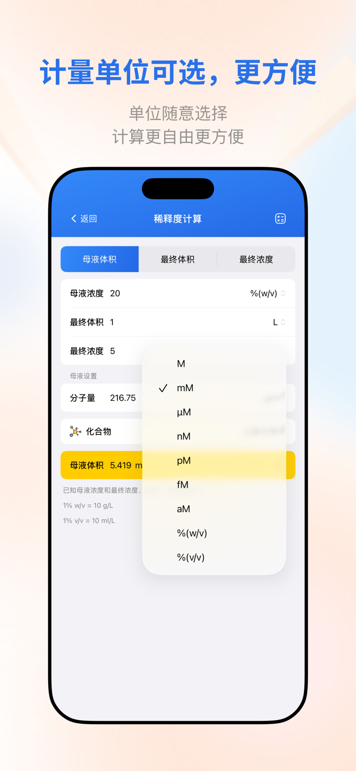• 溶液稀释计算: 完美支持 C1V1 = C2V2 母液稀释计算,支持各种浓度单位。