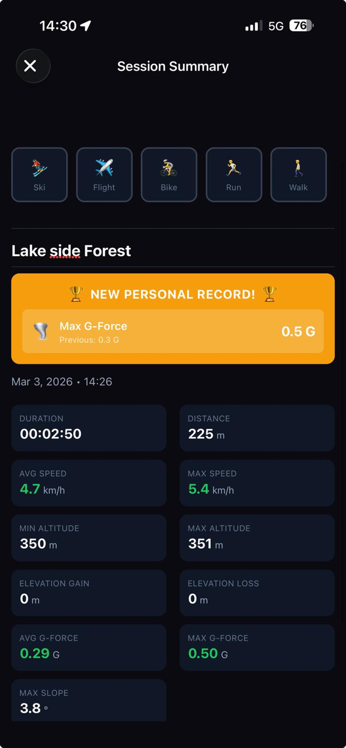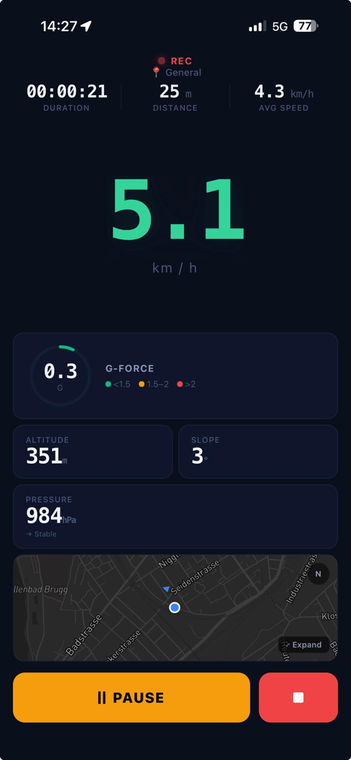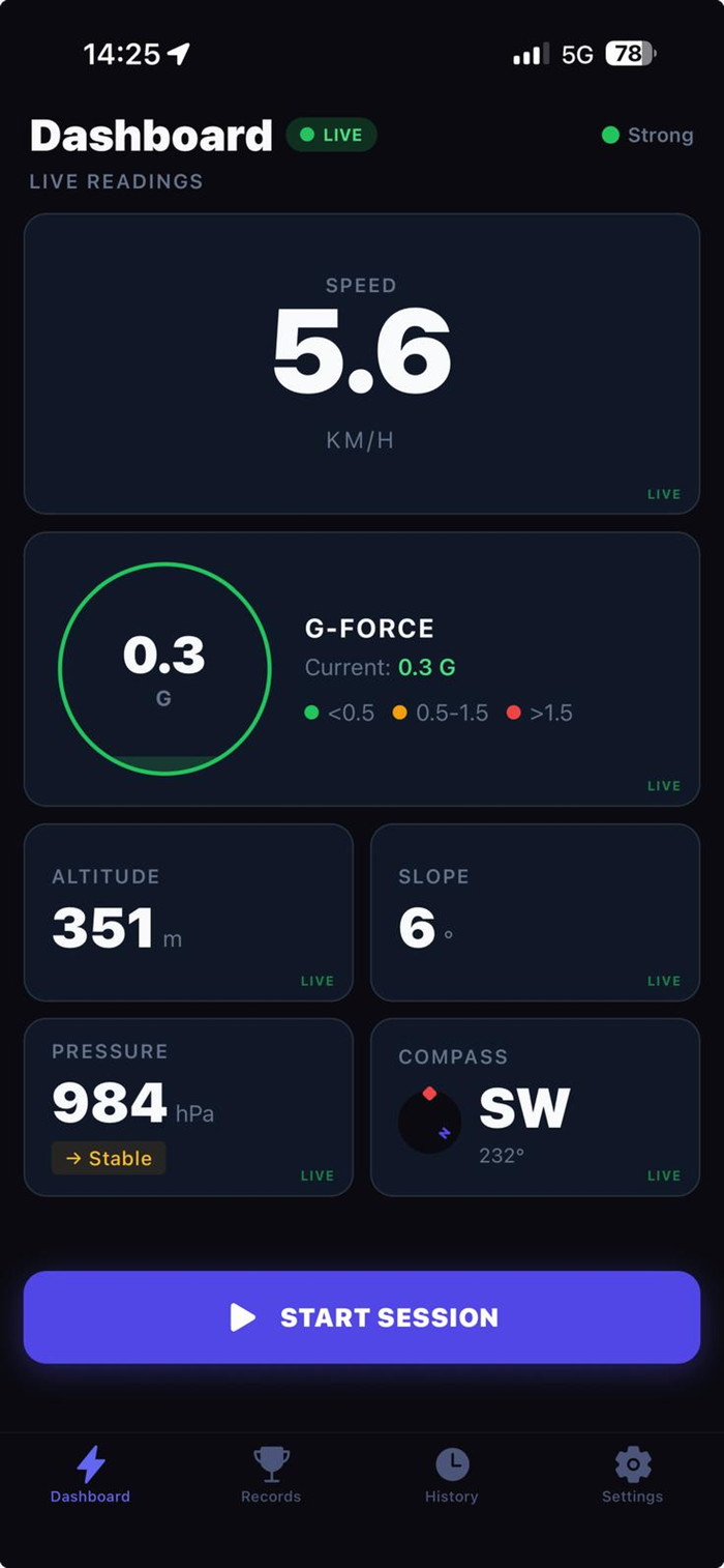查看您的速度、G力、海拔、倾斜角、气压和指南针方向——全部实时显示,配有流畅动画和实时图表。
