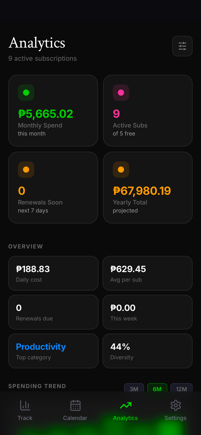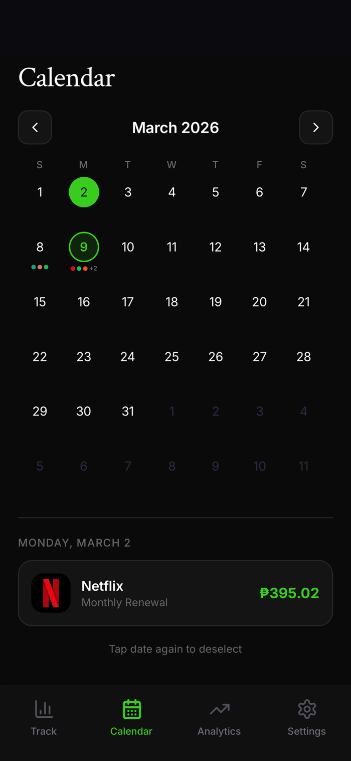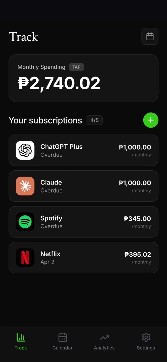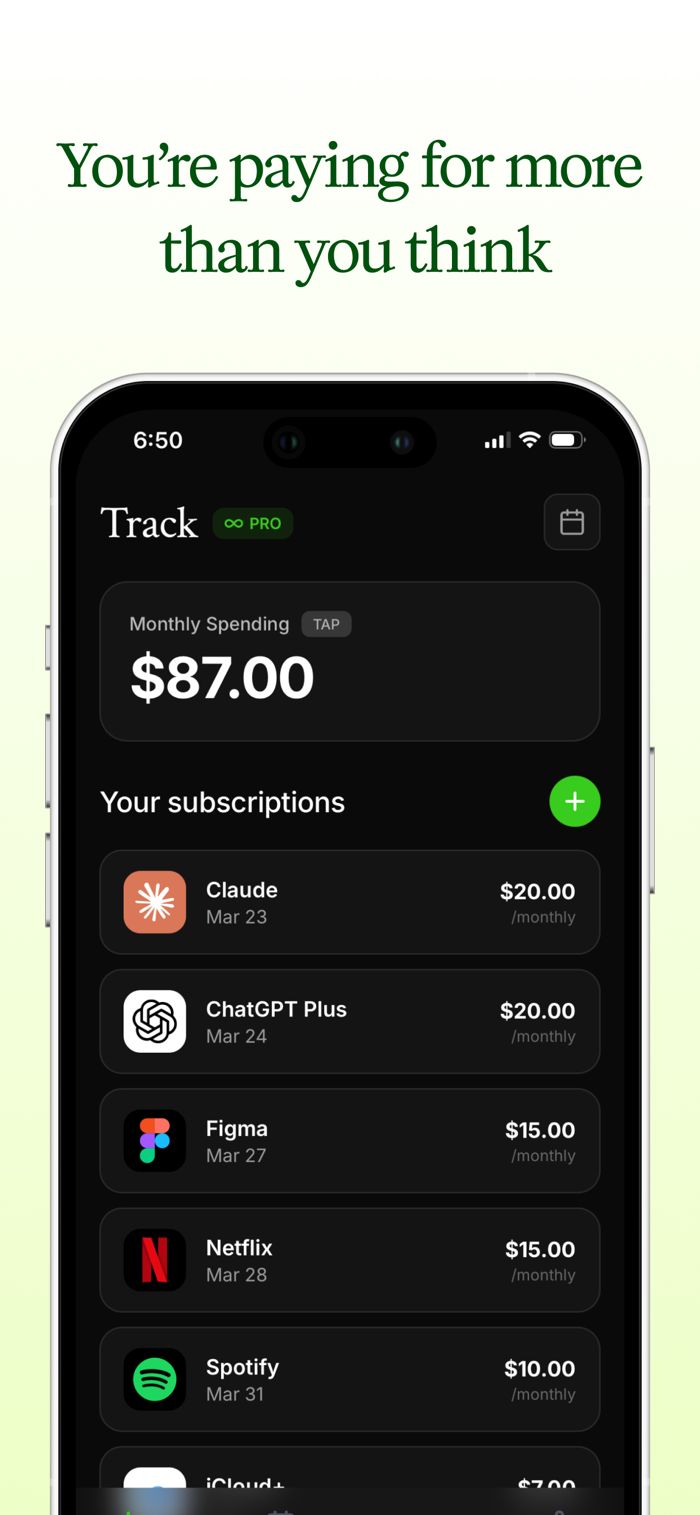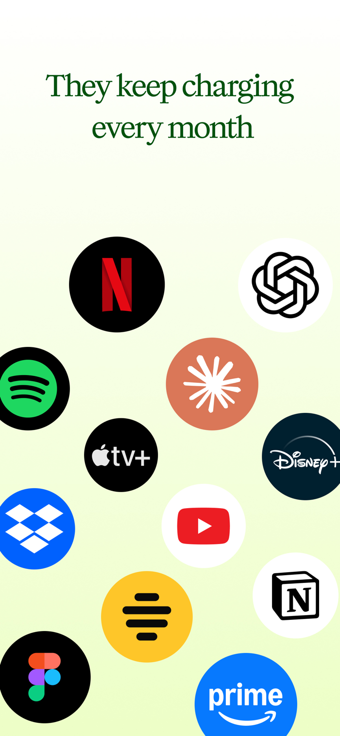 • Track all your subscriptions in one place — Netflix, Spotify, iCloud, and more