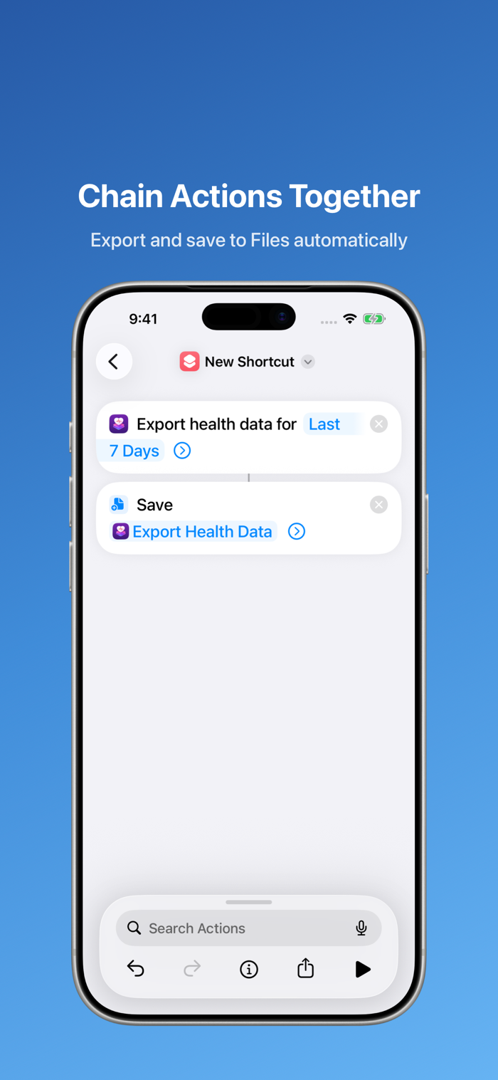 Health Exporter & Shortcuts makes it easy to export your Apple Health data and workouts to clean, structured JSON files — in one tap or fully automated with Siri Shortcuts.