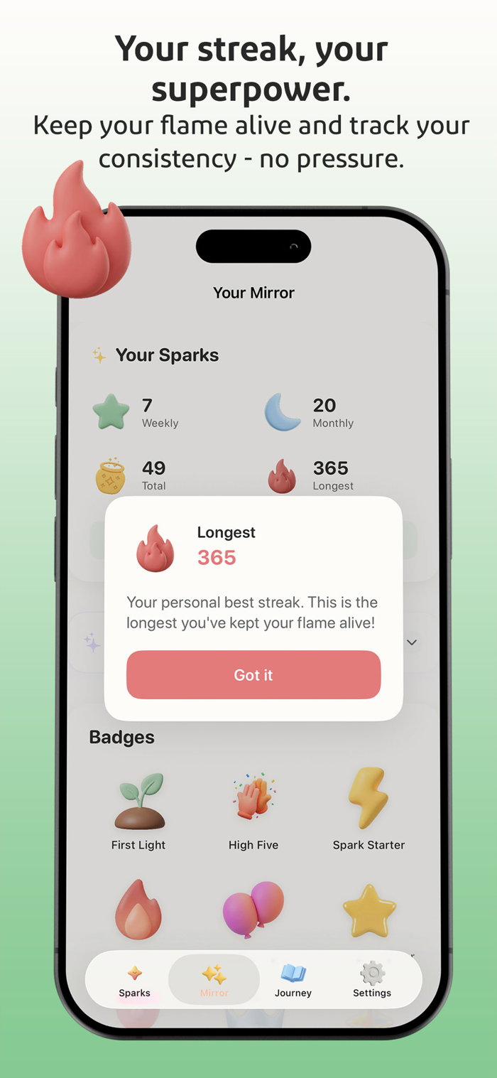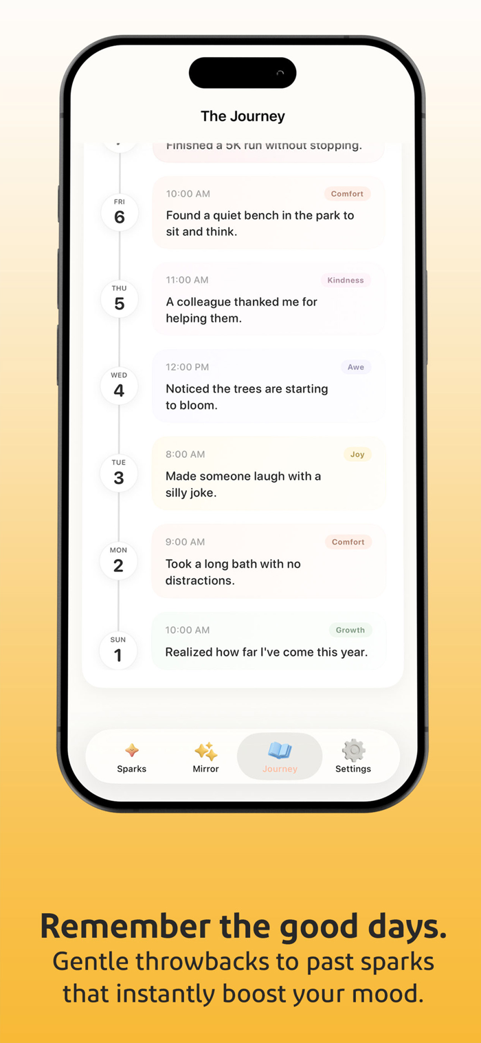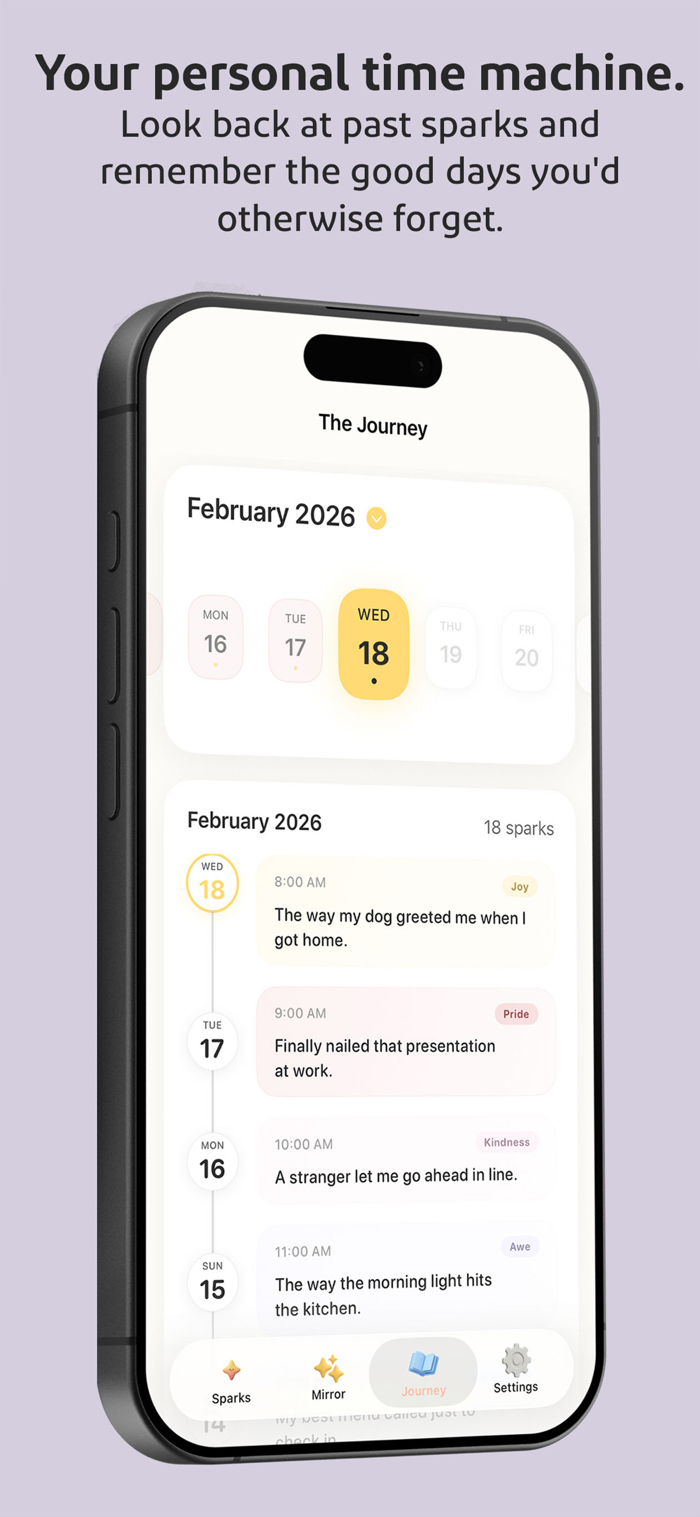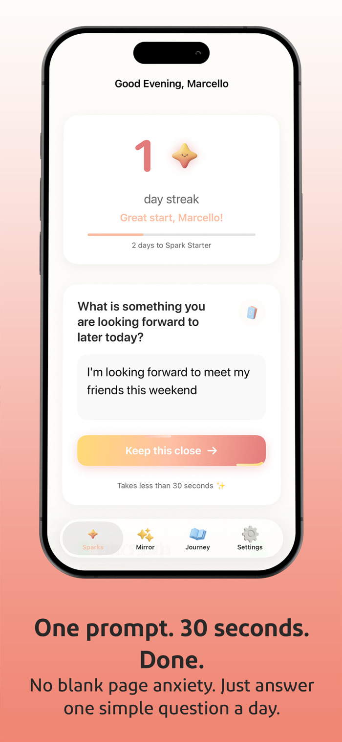 Instead of long journal entries, you capture "sparks": quick, honest moments of gratitude. A good coffee. A friend who checked