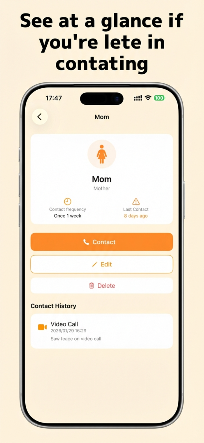CheckInSenior是一款简单的提醒应用程序,可帮助你与远方的老年家庭成员保持联系。核心功能包括:管理家庭成员,设置联系频率提醒,能一眼看到上次联系时间,记录通话、拜访和视频聊天,提供对话主题建议,记录健康状况。支持电话、视频聊天、亲自拜访、短信等联系类型,有季节话题、健康养生、近期新闻等话题建议。适合父母住远方、想定期看望祖父母、易忘给家里打电话、想保持家庭联系的人群,还有免费版。